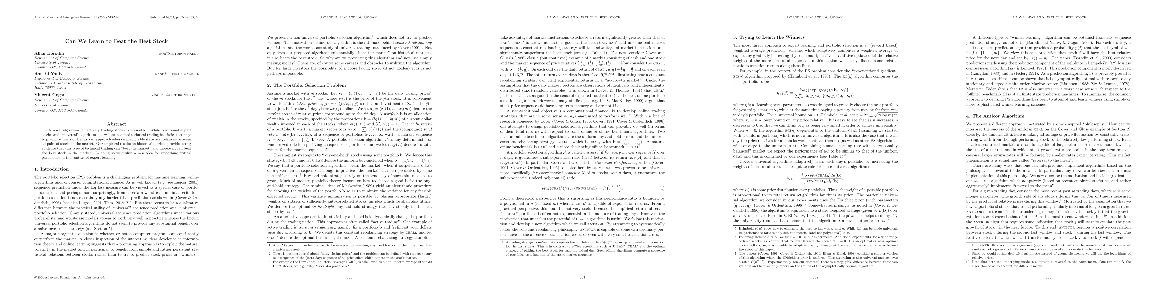 A novel algorithm for actively trading stocks is presented. While traditional expert advice and "universal" algorithms (as well as standard technical trading heuristics) attempt to predict winners or trends, our approach relies on predictable statistical relations between all pairs of stocks in the market. Our empirical results on historical markets provide strong evidence that this type of technical trading can "beat the market" and moreover, can beat the best stock in the market. In doing so we utilize a new idea for smoothing critical parameters in the context of expert learning.