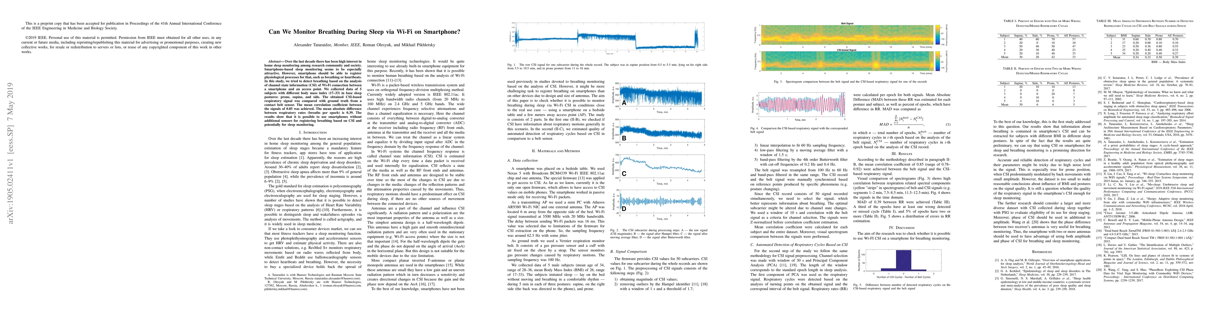 Researchers developed a method to monitor breathing during sleep using Wi-Fi on smartphones, achieving a correlation coefficient of 0.85 with ground truth data.