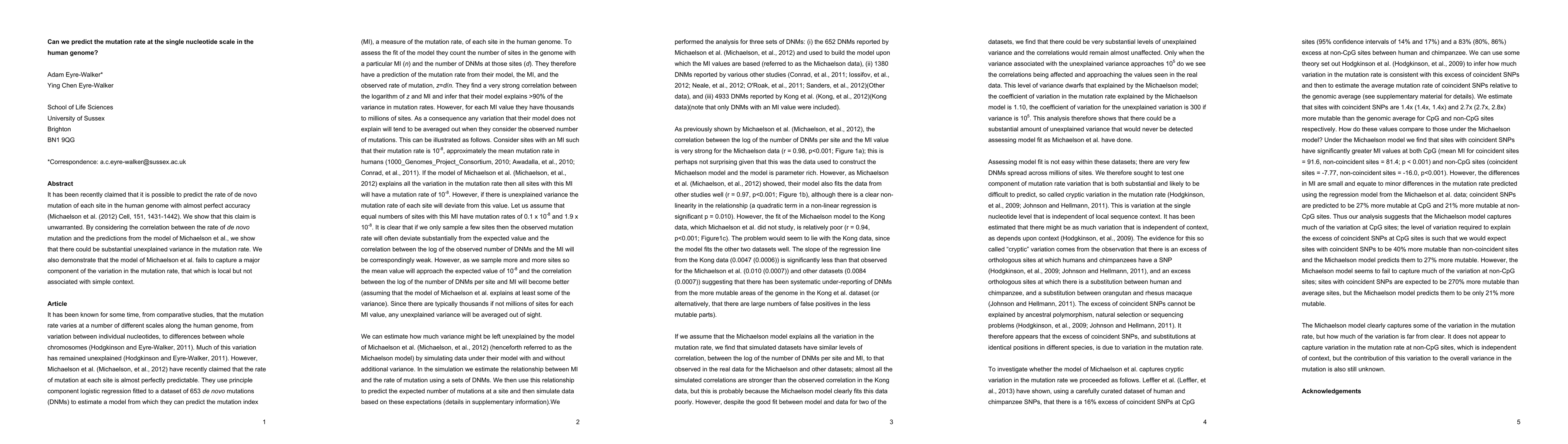 It has been recently claimed that it is possible to predict the rate of de novo mutation of each site in the human genome with almost perfect accuracy (Michaelson et al. (2012) Cell, 151, 1431-1442). We show that this claim is unwarranted. By considering the correlation between the rate of de novo mutation and the predictions from the model of Michaelson et al., we show that there could be substantial unexplained variance in the mutation rate. We also demonstrate that the model of Michaelson et al. fails to capture a major component of the variation in the mutation rate, that which is local but not associated with simple context.