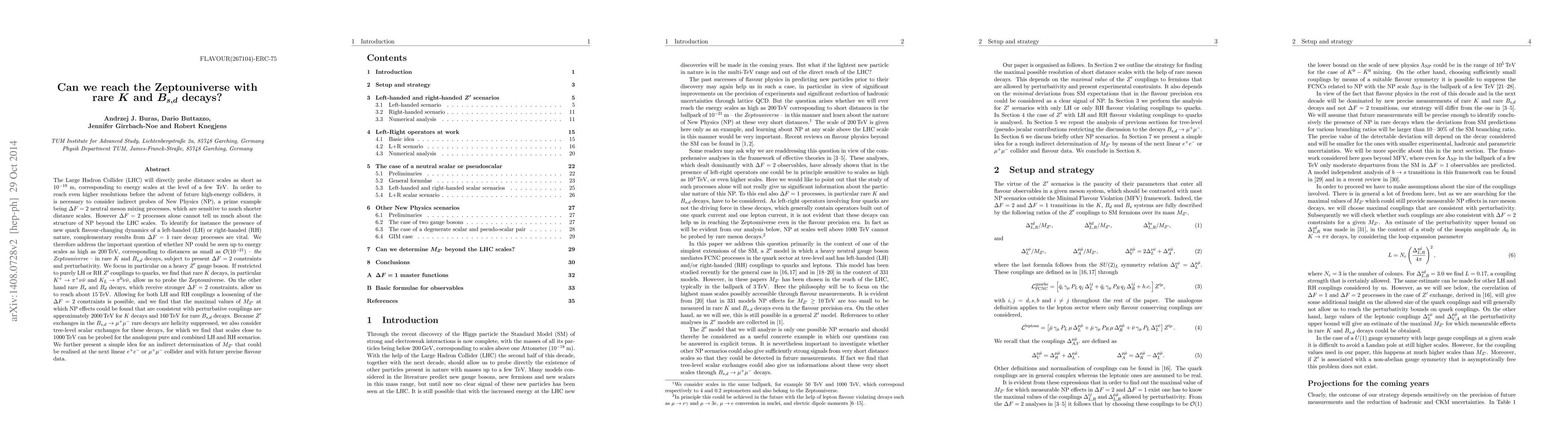 The Large Hadron Collider will directly probe distance scales as short as 10^{-19}m, corresponding to energy scales at the level of a few TeV. In order to reach even higher resolutions before the advent of future high-energy colliders, it is necessary to consider indirect probes of New Physics (NP), a prime example being Delta F=2 neutral meson mixing processes, which are sensitive to much shorter distance scales. However Delta F=2 processes alone cannot tell us much about the structure of NP beyond the LHC scales. To identify for instance the presence of new quark flavour-changing dynamics of a left-handed (LH) or right-handed (RH) nature, complementary results from Delta F=1 rare decay processes are vital. We therefore address the important question of whether NP could be seen up to energy scales as high as 200 TeV, corresponding to distances as small as 10^{-21}m -- the Zeptouniverse -- in rare K and B_{s,d} decays, subject to present Delta F=2 constraints and perturbativity. We focus in particular on a heavy Z' gauge boson. If restricted to purely LH or RH Z' couplings to quarks, we find that rare K decays, in particular KL-> pi^0 nu nubar and K^+->pi^+ nu nubar, allow us to probe the Zeptouniverse. On the other hand rare B_s and B_d decays, which receive stronger Delta F=2 constraints, allow us to reach about 15 TeV. Allowing for both LH and RH couplings a loosening of the Delta F=2 constraints is possible, and we find that the maximal values of M_Z' at which NP effects that are consistent with perturbative couplings could be found are approximately 2000 TeV for K decays and 160 TeV for rare B_{s,d} decays. Finally we present a simple idea for an indirect determination of M_Z' that could be realised at the next linear e^+e^- or mu^+ mu^- collider and with future precise flavour data.