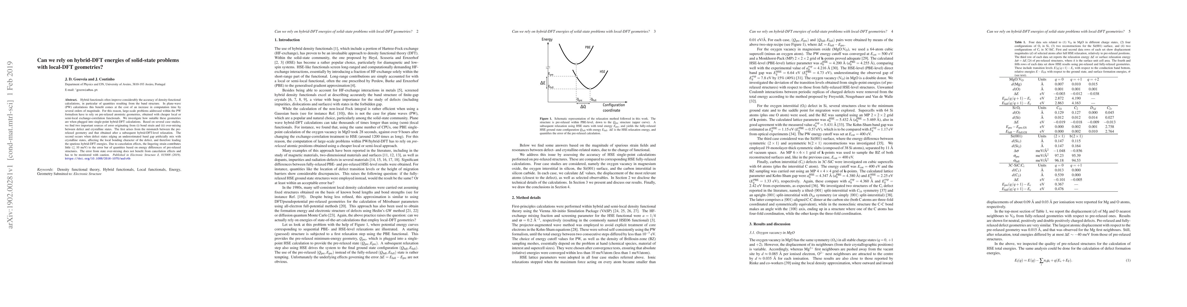 This paper investigates the accuracy of hybrid-DFT energies when using local-DFT geometries for solid-state problems, finding significant errors from bond strain and over-mixing between defect and crystalline states, with the latter posing a more persistent issue.