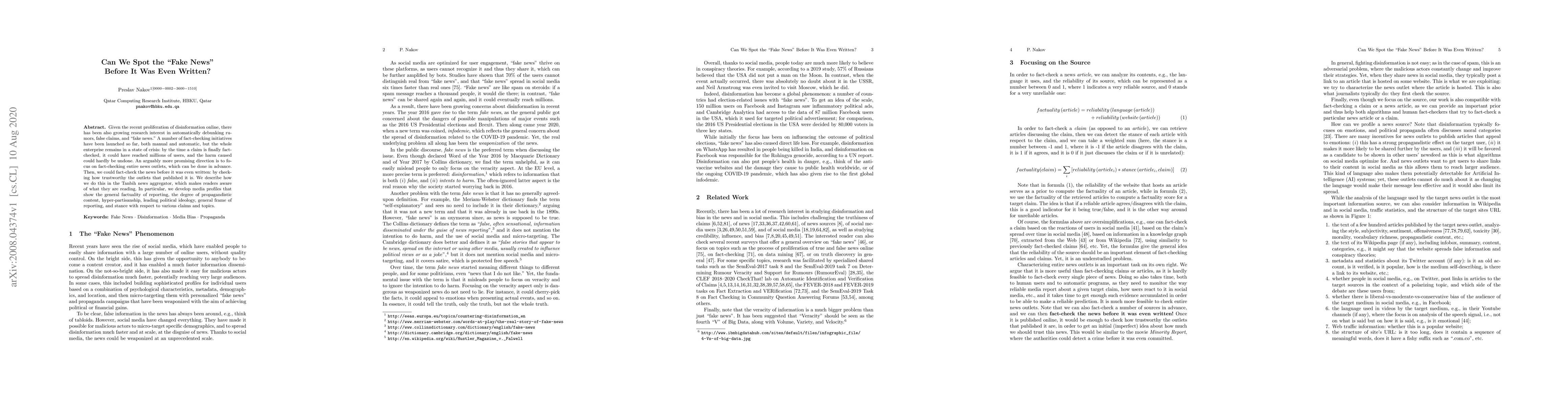Given the recent proliferation of disinformation online, there has been also growing research interest in automatically debunking rumors, false claims, and "fake news." A number of fact-checking initiatives have been launched so far, both manual and automatic, but the whole enterprise remains in a state of crisis: by the time a claim is finally fact-checked, it could have reached millions of users, and the harm caused could hardly be undone. An arguably more promising direction is to focus on fact-checking entire news outlets, which can be done in advance. Then, we could fact-check the news before it was even written: by checking how trustworthy the outlets that published it is. We describe how we do this in the Tanbih news aggregator, which makes readers aware of what they are reading. In particular, we develop media profiles that show the general factuality of reporting, the degree of propagandistic content, hyper-partisanship, leading political ideology, general frame of reporting, and stance with respect to various claims and topics.