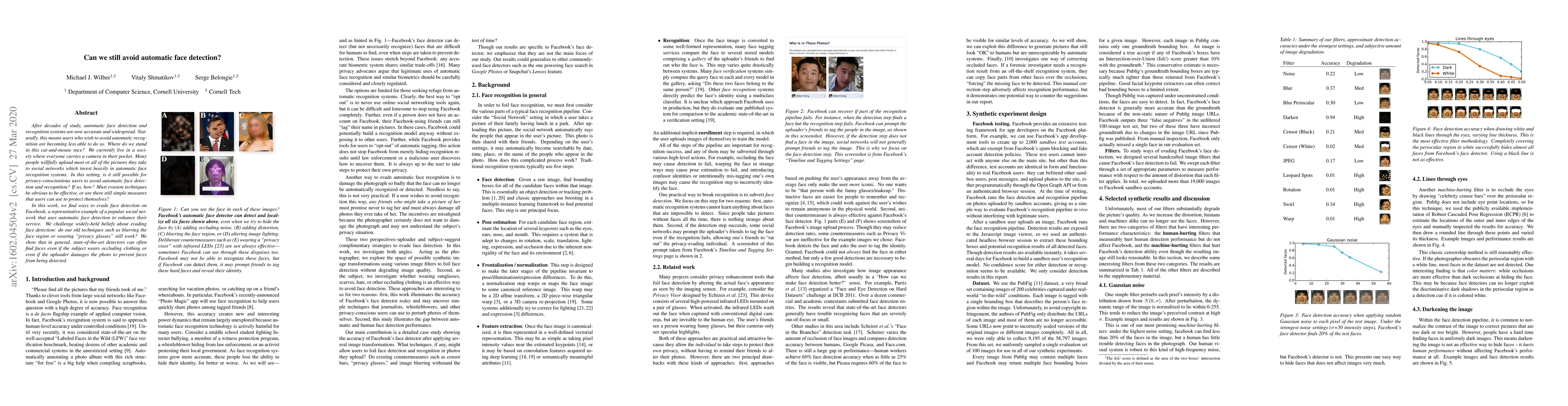 Researchers tested evasion techniques for avoiding automatic face detection on Facebook and found that state-of-the-art detectors can often still find faces even with simple measures such as blurring or occluding clothing.