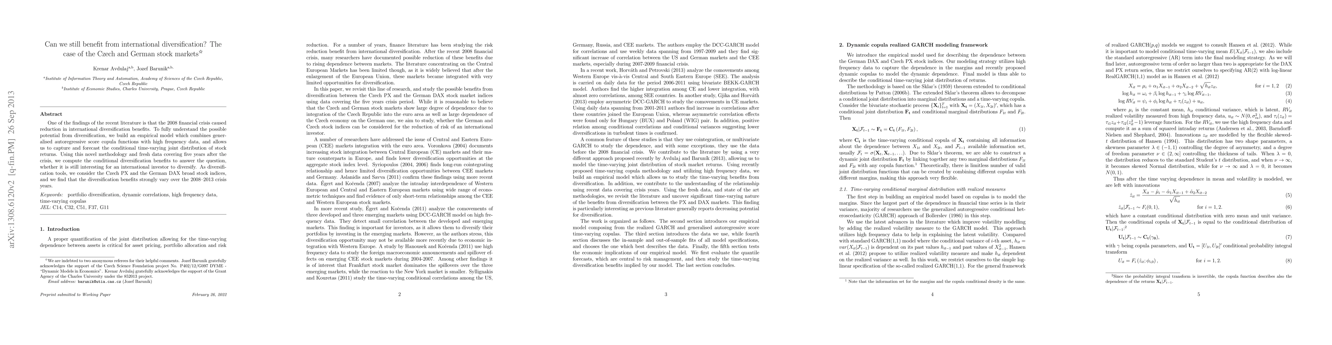 One of the findings of the recent literature is that the 2008 financial crisis caused reduction in international diversification benefits. To fully understand the possible potential from diversification, we build an empirical model which combines generalised autoregressive score copula functions with high frequency data, and allows us to capture and forecast the conditional time-varying joint distribution of stock returns. Using this novel methodology and fresh data covering five years after the crisis, we compute the conditional diversification benefits to answer the question, whether it is still interesting for an international investor to diversify. As diversification tools, we consider the Czech PX and the German DAX broad stock indices, and we find that the diversification benefits strongly vary over the 2008--2013 crisis years.