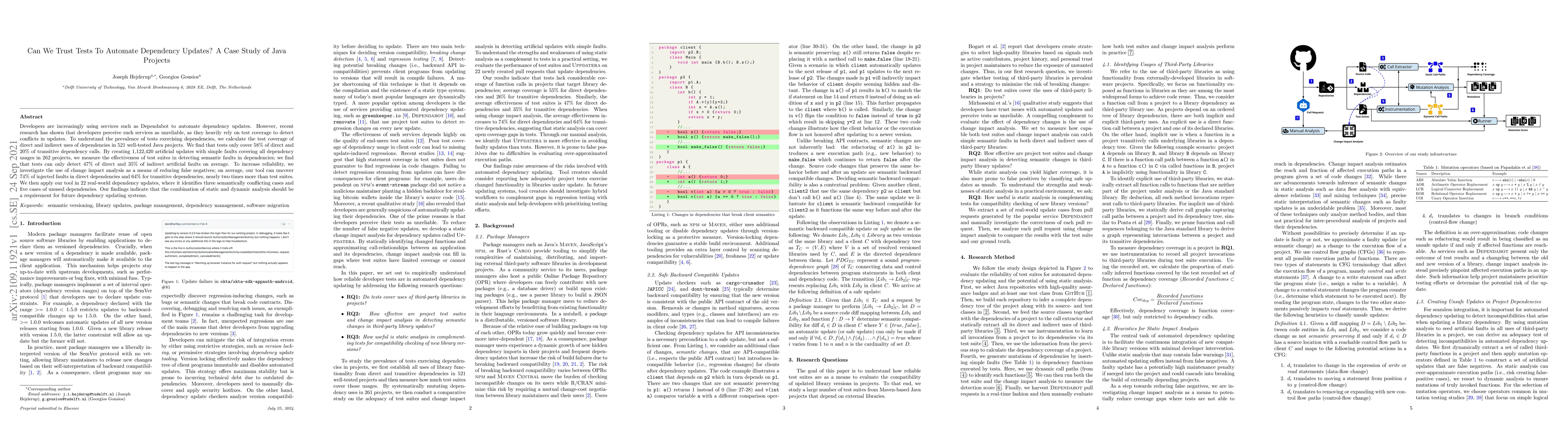 Tests for automated dependency updates in Java projects only detect 47% of direct and 35% of indirect faults, highlighting the need for a combination of static and dynamic analysis.