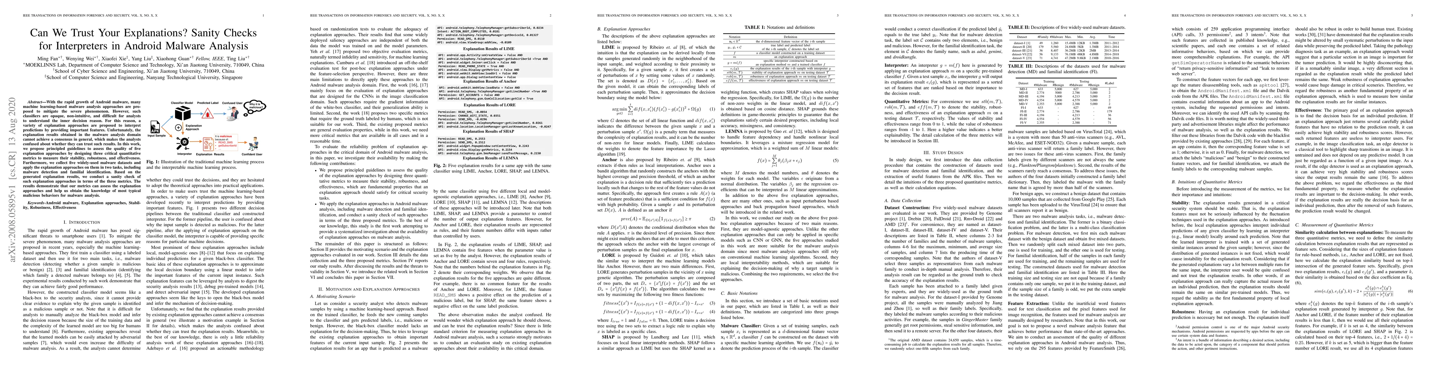 With the rapid growth of Android malware, many machine learning-based malware analysis approaches are proposed to mitigate the severe phenomenon. However, such classifiers are opaque, non-intuitive, and difficult for analysts to understand the inner decision reason. For this reason, a variety of explanation approaches are proposed to interpret predictions by providing important features. Unfortunately, the explanation results obtained in the malware analysis domain cannot achieve a consensus in general, which makes the analysts confused about whether they can trust such results. In this work, we propose principled guidelines to assess the quality of five explanation approaches by designing three critical quantitative metrics to measure their stability, robustness, and effectiveness. Furthermore, we collect five widely-used malware datasets and apply the explanation approaches on them in two tasks, including malware detection and familial identification. Based on the generated explanation results, we conduct a sanity check of such explanation approaches in terms of the three metrics. The results demonstrate that our metrics can assess the explanation approaches and help us obtain the knowledge of most typical malicious behaviors for malware analysis.