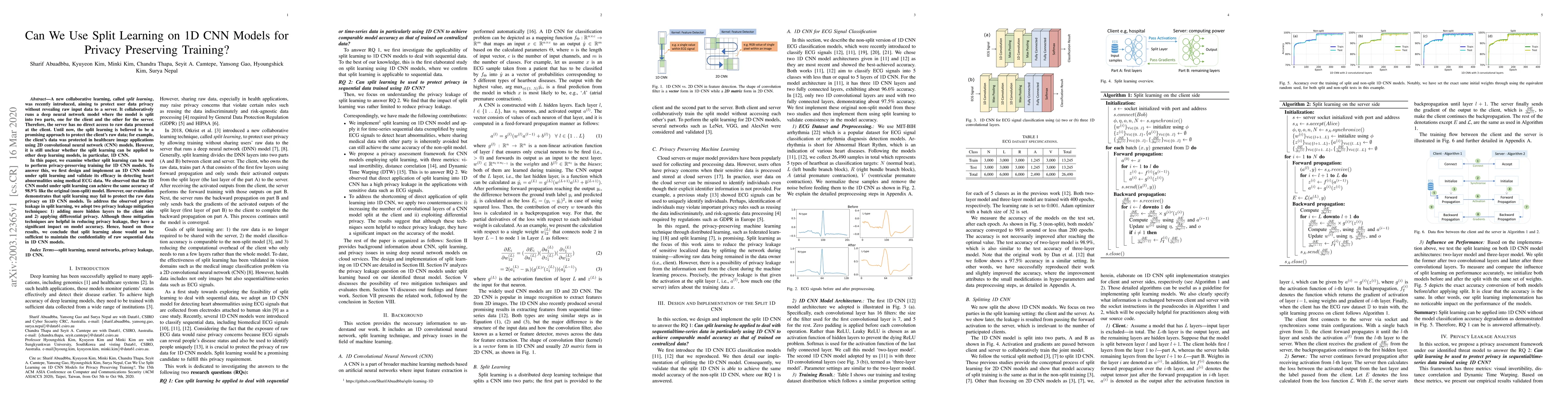 Researchers explored using split learning for privacy-preserving training on 1D CNN models, finding that while it maintains accuracy, it fails to protect raw data privacy and recommend additional techniques for mitigation.