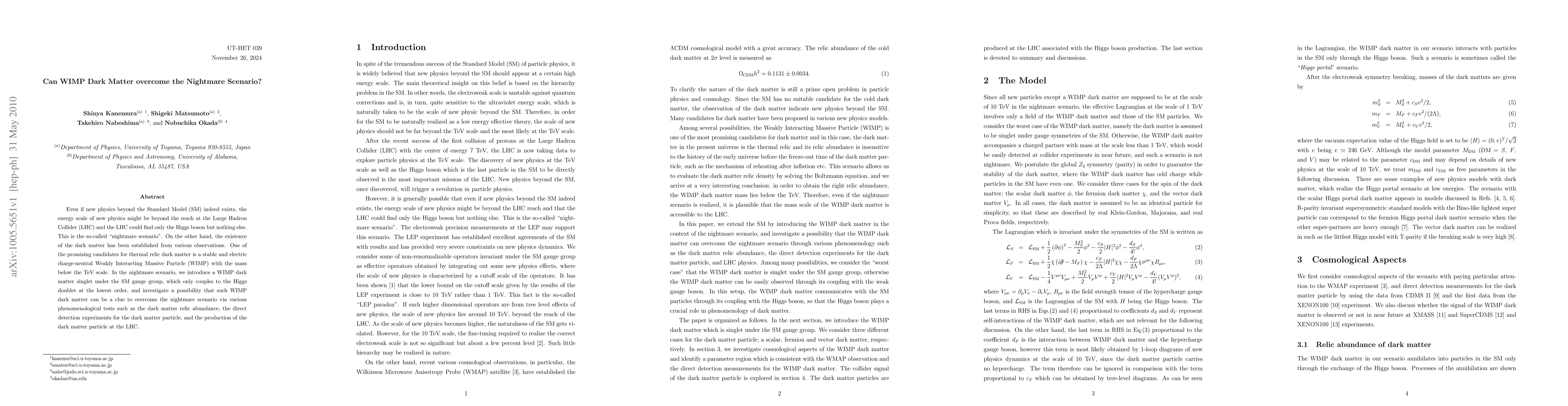 This paper explores whether Weakly Interacting Massive Particles (WIMPs) could serve as dark matter candidates to provide evidence against the "nightmare scenario" where the Large Hadron Collider finds only the Higgs boson, leaving new physics beyond the Standard Model inaccessible. It investigates WIMP dark matter's potential through various phenomenological tests, including relic abundance and direct detection experiments.