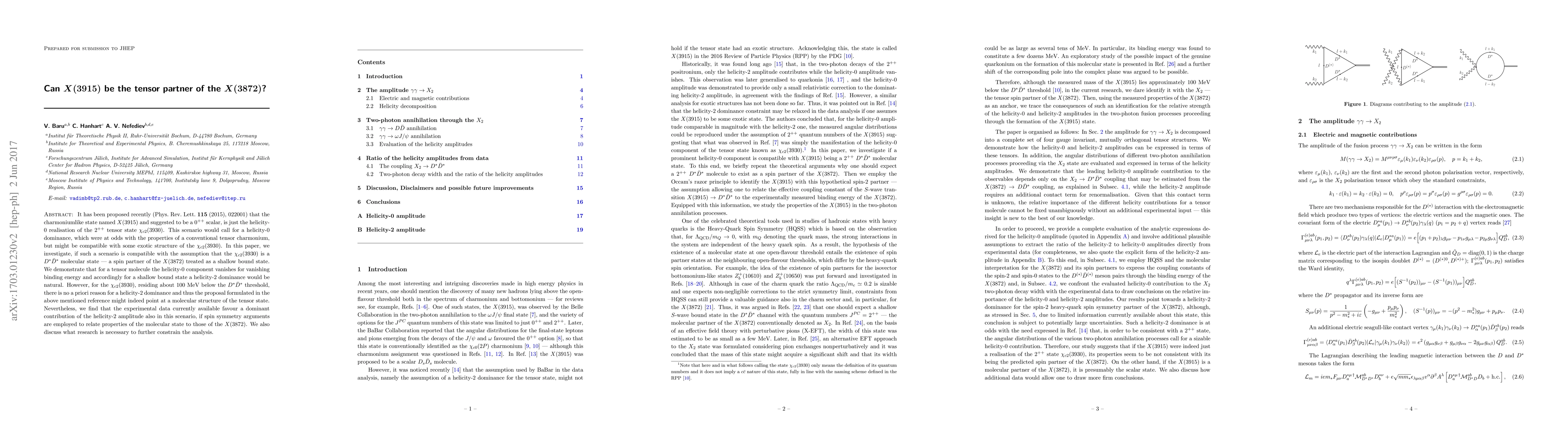 This paper explores whether the charmoniumlike state X(3915) could be the tensor partner of the X(3872), suggesting it might be a $0^{++}$ scalar helicity-0 realization of the $2^{++}$ tensor state $\chi_{c2}(3930)$. The analysis finds that while a tensor molecule's helicity-0 component vanishes with zero binding energy, the current experimental data favors a dominant helicity-2 contribution, indicating further research is needed to clarify the structure.