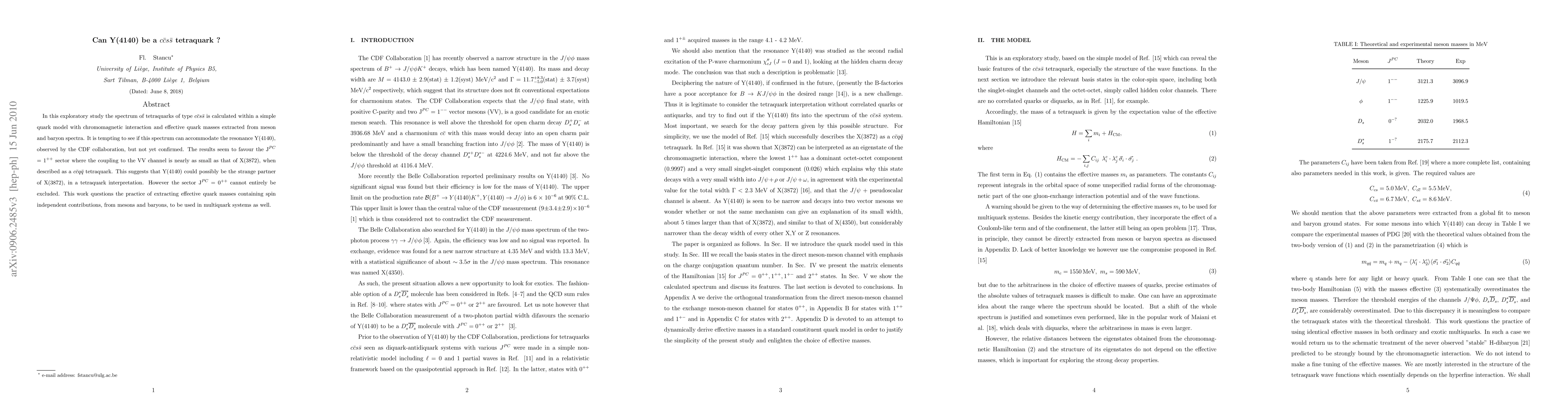 In this exploratory study the spectrum of tetraquarks of type $c \bar c s \bar s$ is calculated within a simple quark model with chromomagnetic interaction and effective quark masses extracted from meson and baryon spectra. It is tempting to see if this spectrum can accommodate the resonance Y(4140), observed by the CDF collaboration, but not yet confirmed. The results seem to favour the J$^{PC}$ = 1$^{++}$ sector where the coupling to the VV channel is nearly as small as that of X(3872), when described as a $c \bar c q \bar q$ tetraquark. This suggests that Y(4140) could possibly be the strange partner of X(3872), in a tetraquark interpretation. However the sector J$^{PC}$ = 0$^{++}$ cannot entirely be excluded. This work questions the practice of extracting effective quark masses containing spin independent contributions, from mesons and baryons, to be used in multiquark systems as well.