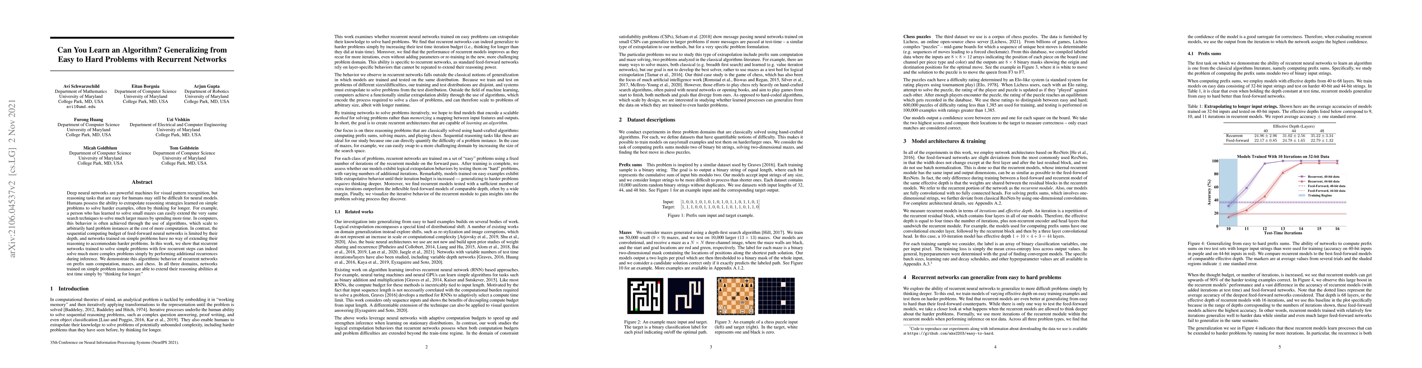 This paper investigates how recurrent neural networks can generalize from simple to complex problems by extending their reasoning through additional recurrent steps, demonstrating this capability in prefix sum computation, mazes, and chess. Unlike feed-forward networks, recurrent networks can "think for longer" to solve harder problems.