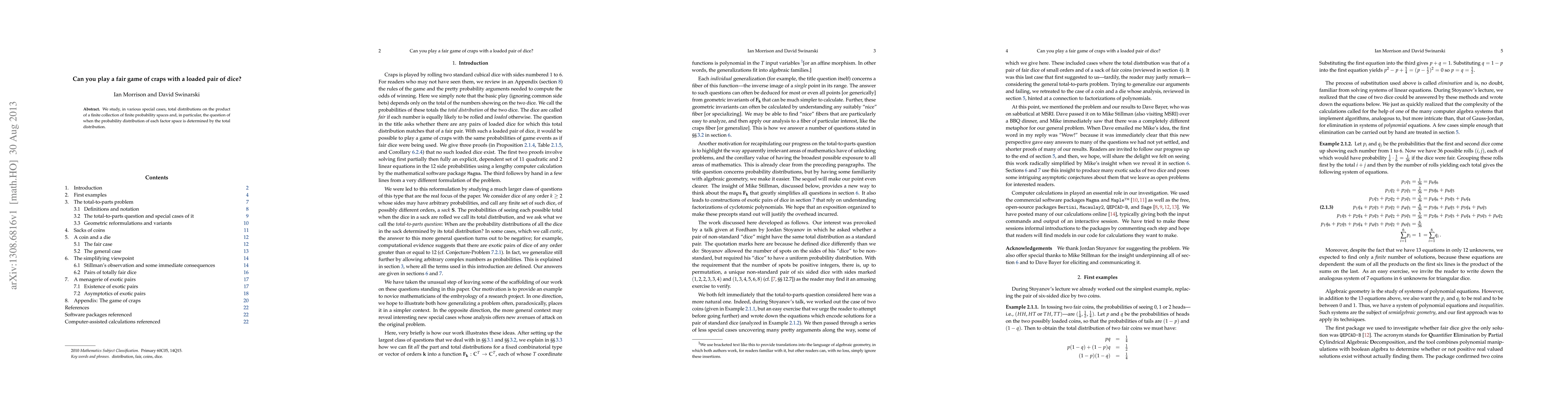 We study, in various special cases, total distributions on the product of a finite collection of finite probability spaces and, in particular, the question of when the probability distribution of each factor space is determined by the total distribution.