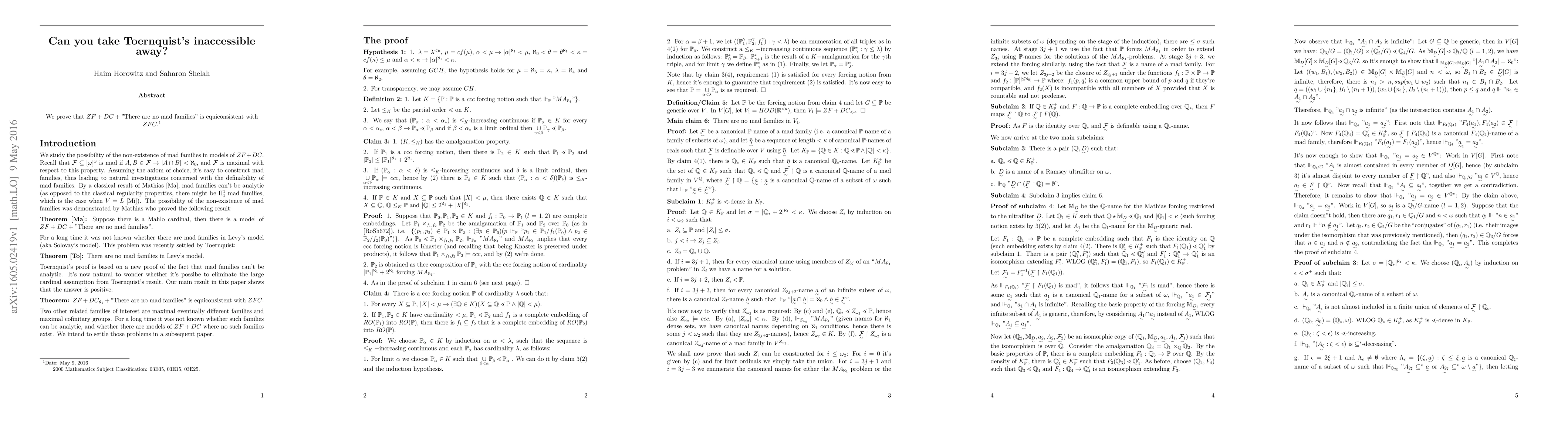 We prove that ZF+DC+"There are no mad families" is equiconsistent with ZFC.