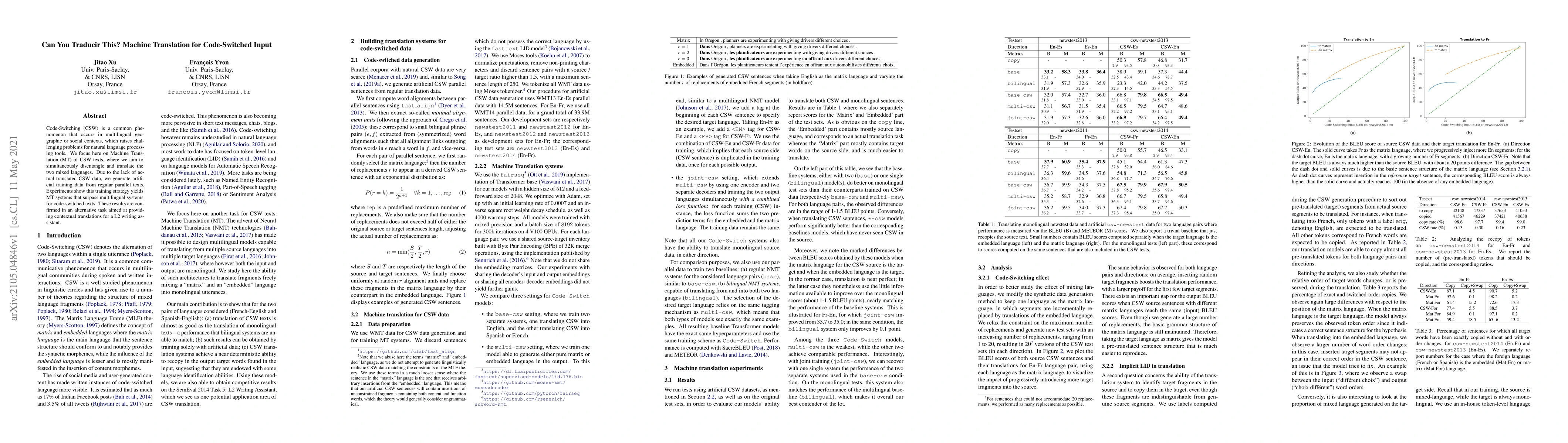 Code-Switching (CSW) is a common phenomenon that occurs in multilingual geographic or social contexts, which raises challenging problems for natural language processing tools. We focus here on Machine Translation (MT) of CSW texts, where we aim to simultaneously disentangle and translate the two mixed languages. Due to the lack of actual translated CSW data, we generate artificial training data from regular parallel texts. Experiments show this training strategy yields MT systems that surpass multilingual systems for code-switched texts. These results are confirmed in an alternative task aimed at providing contextual translations for a L2 writing assistant.