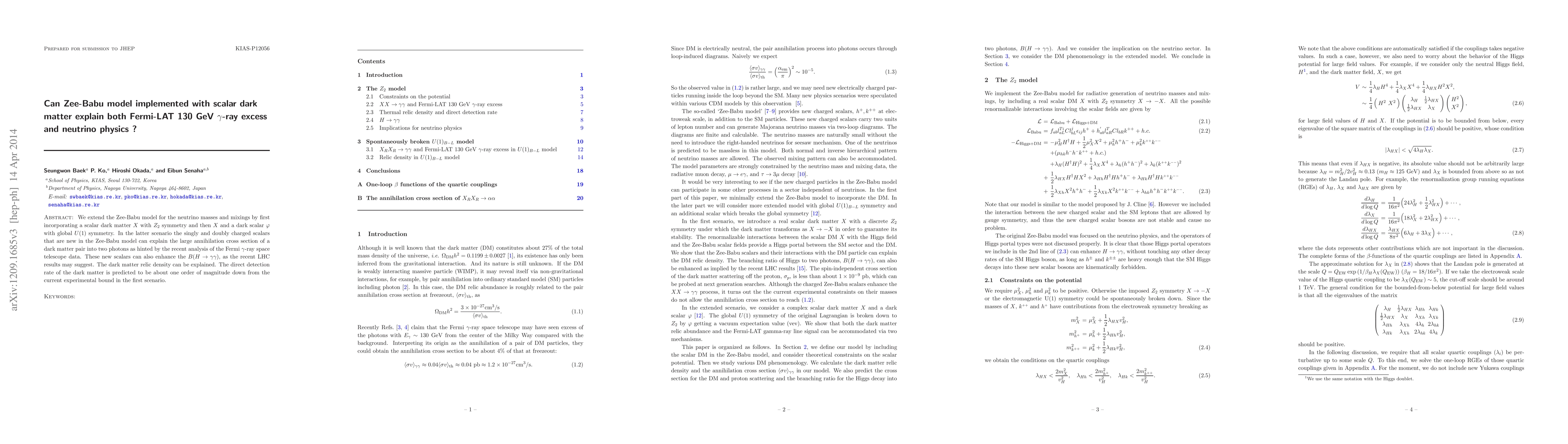 This paper explores if the Zee-Babu model, augmented with scalar dark matter, can account for the Fermi-LAT 130 GeV gamma-ray excess and neutrino physics. The extended model incorporates a dark scalar and predicts the dark matter relic density, while also potentially explaining the observed gamma-ray excess and the enhancement of $B ( H \rightarrow \gamma\gamma )$.