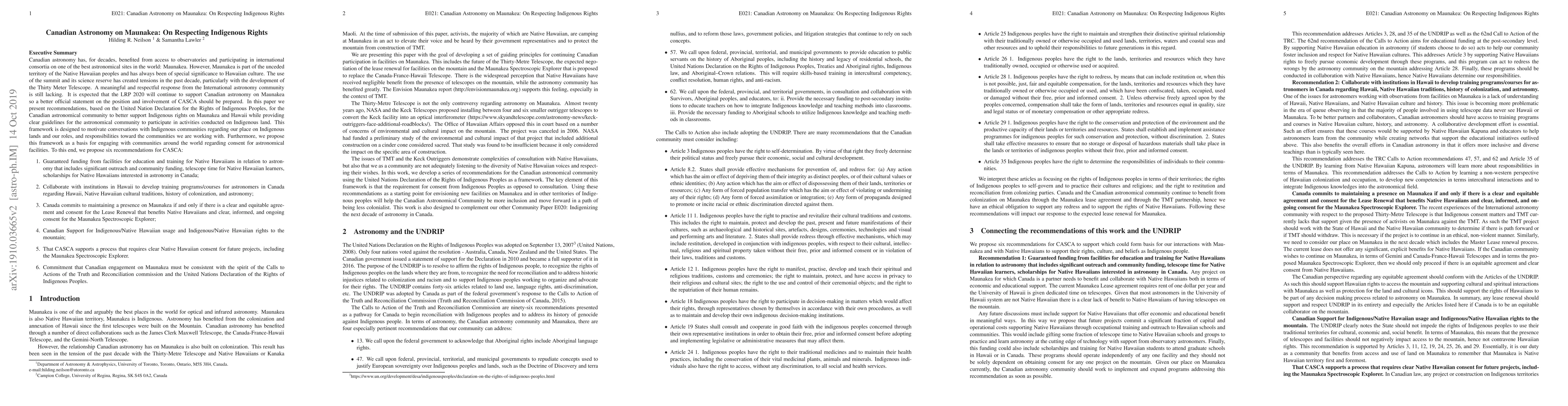 This paper recommends that the Canadian astronomical community adopt a framework based on the United Nations Declaration for the Rights of Indigenous Peoples to better respect and support Indigenous rights on Maunakea and in Hawaii. It aims to foster meaningful conversations and provide clear guidelines for astronomical activities on Indigenous lands globally.