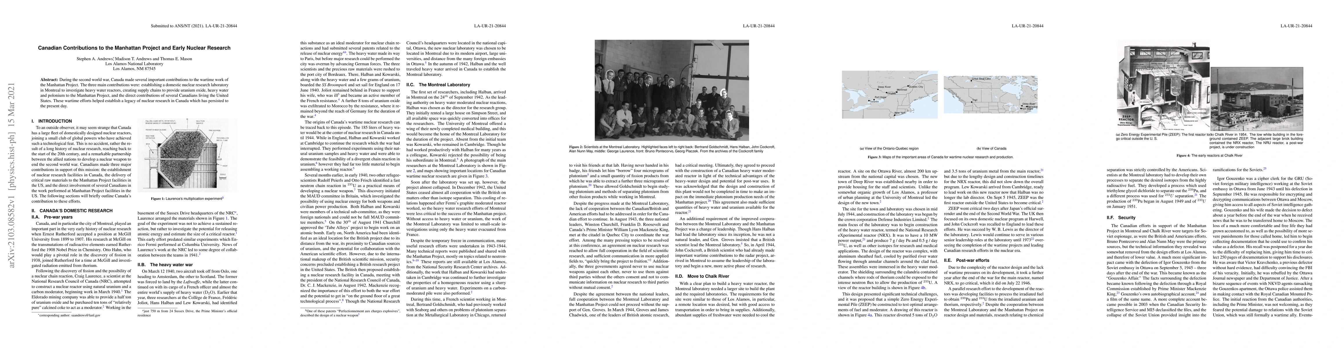 During the second world war, Canada made several important contributions to the wartime work of the Manhattan Project. The three main contributions were: establishing a domestic nuclear research laboratory in Montreal to investigate heavy water reactors, creating supply chains to provide uranium oxide, heavy water and polonium to the Manhattan Project, and the direct contributions of several Canadians living the United States. These wartime efforts helped establish a legacy of nuclear research in Canada which has persisted to the present day.