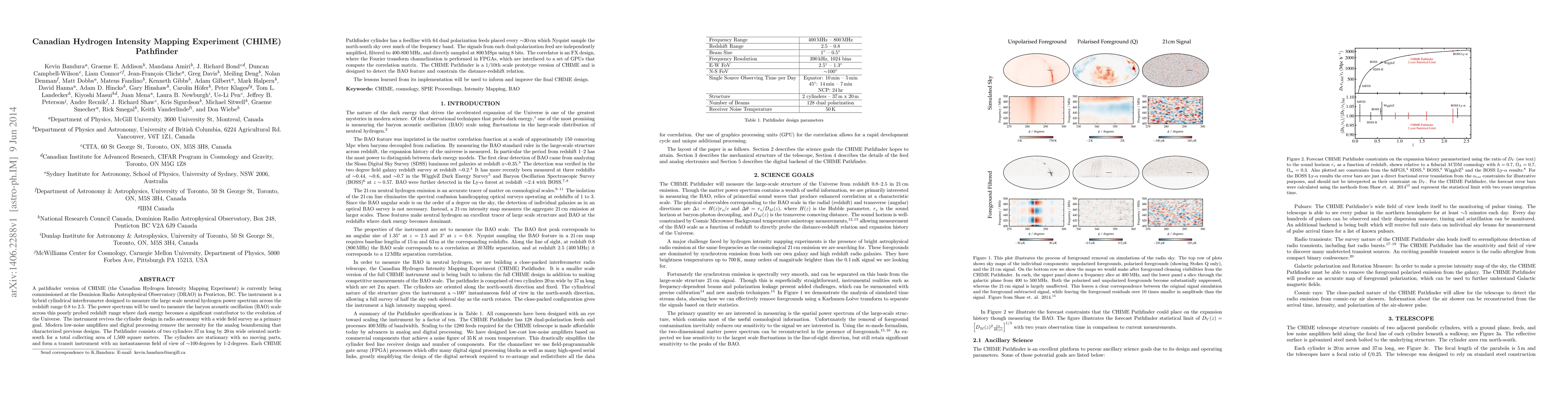 The CHIME Pathfinder, a prototype of the Canadian Hydrogen Intensity Mapping Experiment, is a hybrid cylindrical interferometer designed to measure the neutral hydrogen power spectrum and detect baryon acoustic oscillations across redshifts 0.8 to 2.5. It features dual-polarization feeds and advanced digital processing to survey the north-south sky.