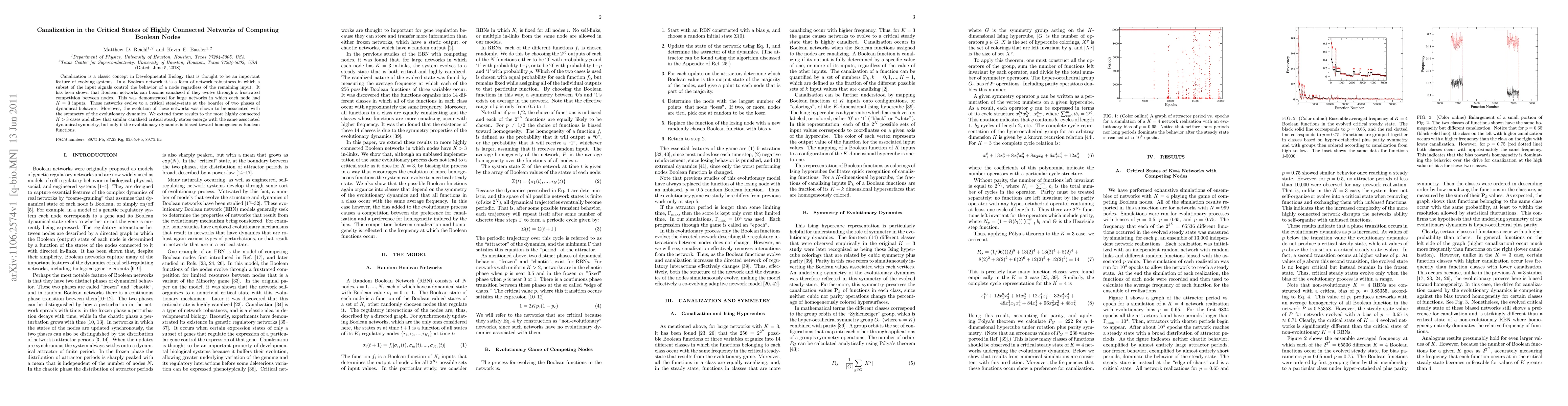 Canalization is a classic concept in Developmental Biology that is thought to be an important feature of evolving systems. In a Boolean network it is a form of network robustness in which a subset of the input signals control the behavior of a node regardless of the remaining input. It has been shown that Boolean networks can become canalized if they evolve through a frustrated competition between nodes. This was demonstrated for large networks in which each node had K=3 inputs. Those networks evolve to a critical steady-state at the boarder of two phases of dynamical behavior. Moreover, the evolution of these networks was shown to be associated with the symmetry of the evolutionary dynamics. We extend these results to the more highly connected K>3 cases and show that similar canalized critical steady states emerge with the same associated dynamical symmetry, but only if the evolutionary dynamics is biased toward homogeneous Boolean functions.