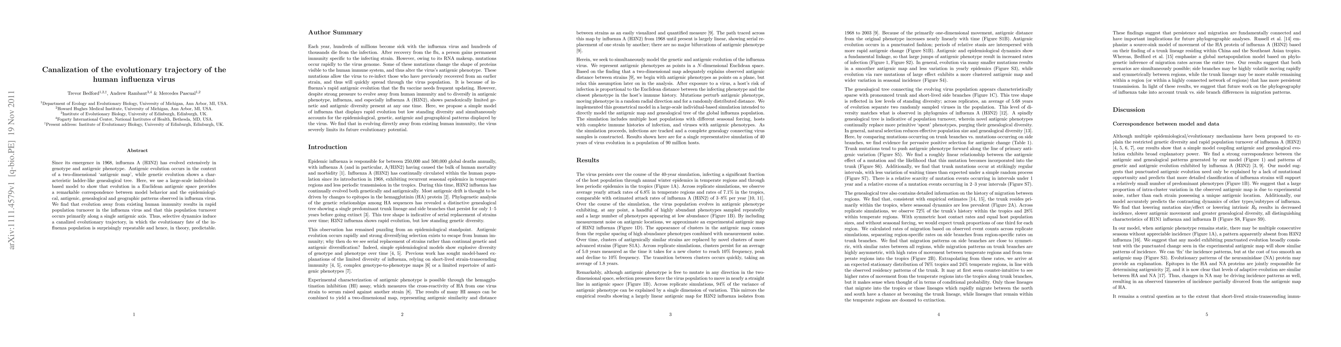 This study demonstrates that the evolutionary trajectory of the influenza A (H3N2) virus is canalized due to selective pressures, leading to predictable population turnover primarily along a single antigenic axis. The research uses a large-scale model to correlate observed epidemiological and antigenic patterns with evolutionary behavior in a Euclidean antigenic space.