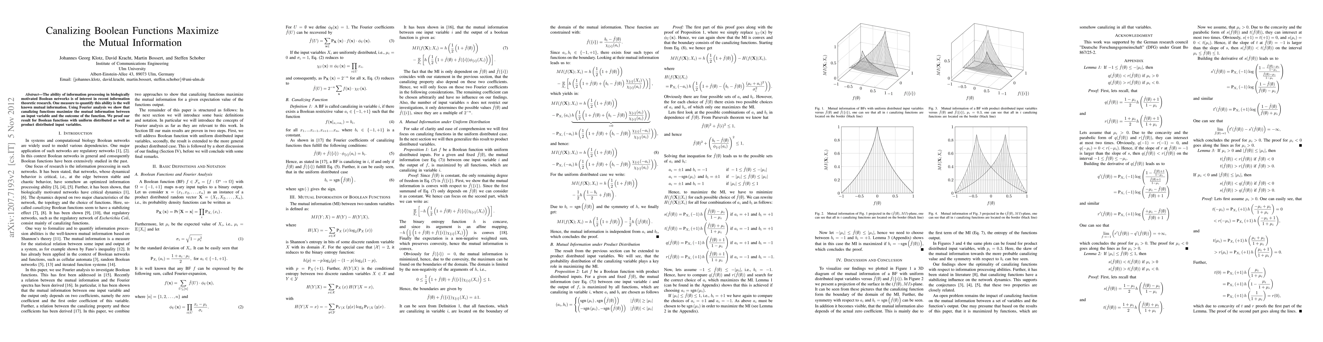 This paper demonstrates that canalizing Boolean functions, which allow certain input variables to directly influence the output, maximize mutual information between input and output in biologically inspired Boolean networks. The authors prove this result using Fourier analysis for both uniformly and product-distributed input variables.