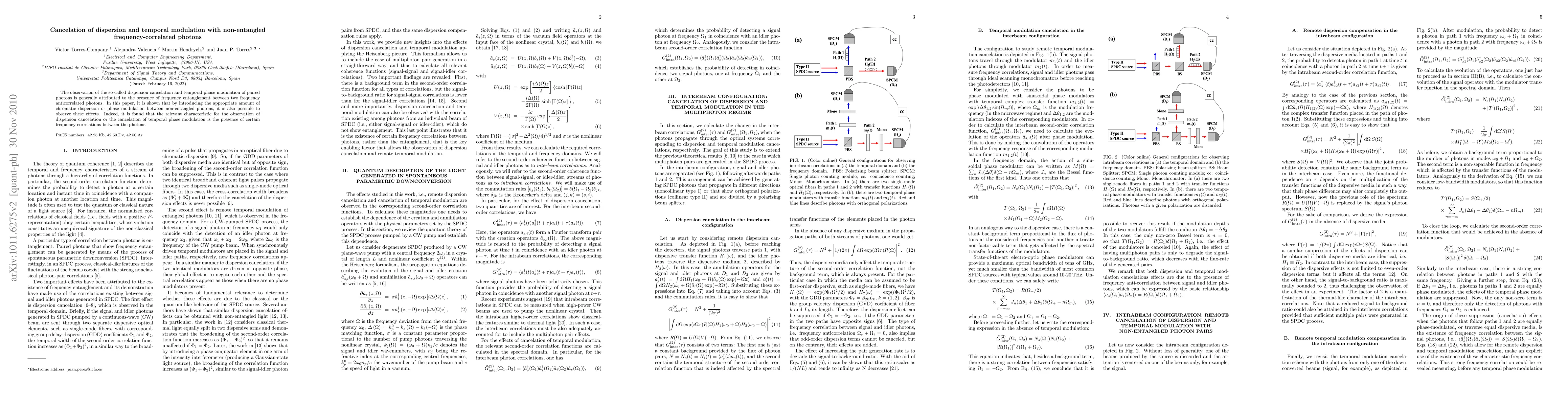 The observation of the so-called dispersion cancelation (Opt. Express 17, 19244, 2009) and temporal phase modulation (Phys. Rev. Lett. 103, 163601, 2009) of paired photons is generally attributed to the presence of frequency entanglement between two frequency anticorrelated photons. In this paper, it is shown that by introducing the appropriate amount of chromatic dispersion or phase modulation between non-entangled photons, it is also possible to observe these effects. Indeed, it is found that the relevant characteristic for the observation of dispersion cancelation or the cancelation of temporal phase modulation is the presence of certain frequency correlations between the photons.
