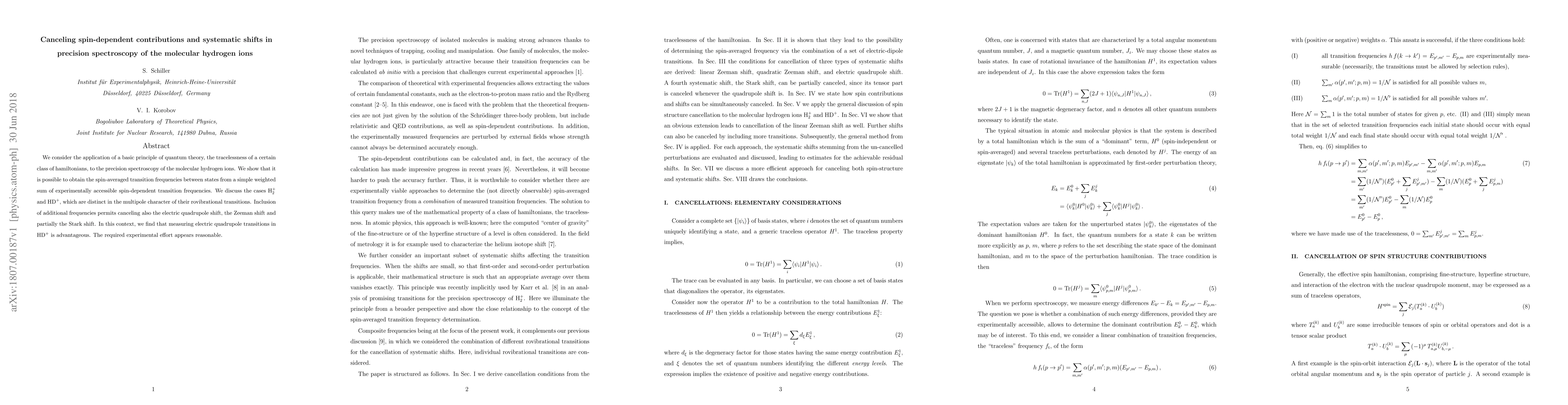 This paper explores the application of quantum theory's tracelessness principle to precision spectroscopy of molecular hydrogen ions ${\rm H}_{2}^{+}$ and ${\rm HD}^{+}$. The authors demonstrate a method to cancel spin-dependent contributions and systematic shifts, including electric quadrupole, Zeeman, and Stark shifts, through a weighted sum of spin-dependent transition frequencies, finding that measuring electric quadrupole transitions in ${\rm HD}^{+}$ is particularly advantageous.