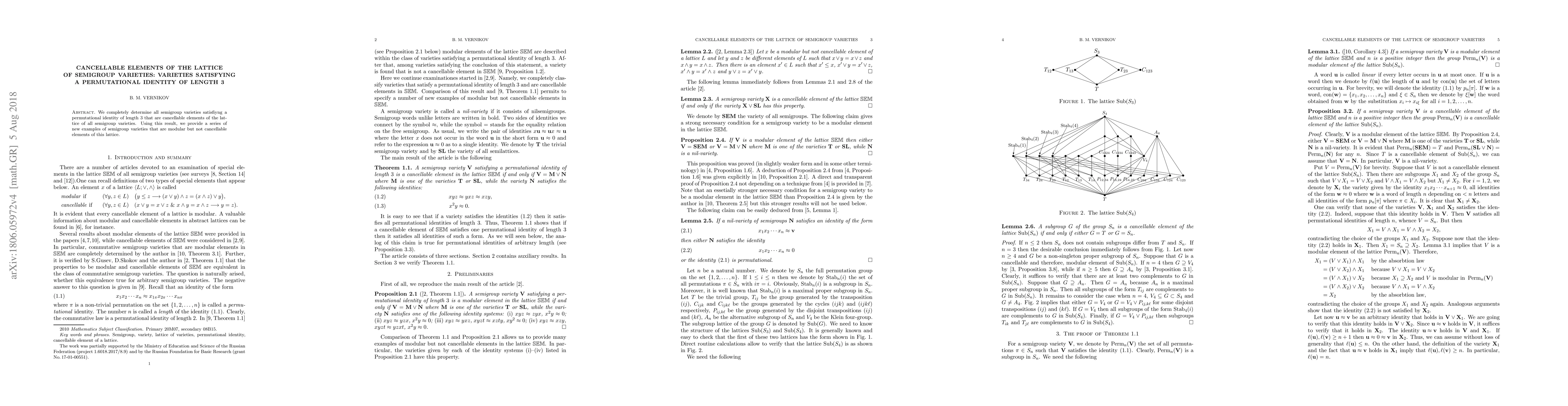 This paper identifies all semigroup varieties that satisfy a permutational identity of length 3 and are cancellable in the lattice of all semigroup varieties. It also presents new examples of semigroup varieties that are modular but not cancellable in this lattice.