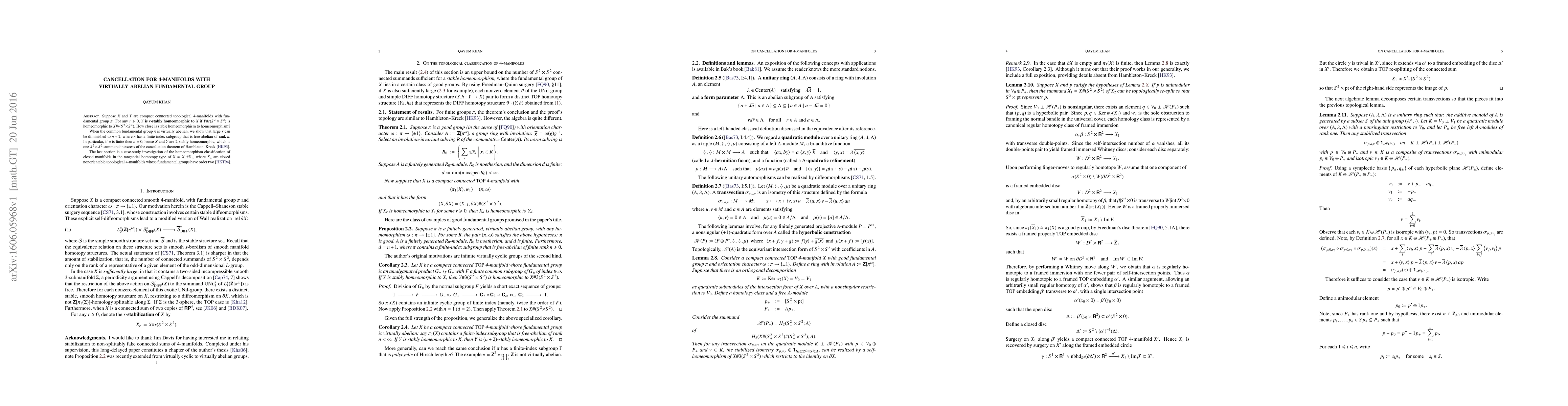 Suppose $X$ and $Y$ are compact connected topological 4-manifolds with fundamental group $\pi$. For any $r \geqslant 0$, $Y$ is $r$-stably homeomorphic to $X$ if $Y \# r(S^2 \times S^2)$ is homeomorphic to $X \# r(S^2\times S^2)$. How close is stable homeomorphism to homeomorphism? When the common fundamental group $\pi$ is virtually abelian, we show that large $r$ can be diminished to $n+2$, where $\pi$ has a finite-index subgroup that is free-abelian of rank $n$. In particular, if $\pi$ is finite then $n=0$, hence $X$ and $Y$ are $2$-stably homeomorphic, which is one $S^2 \times S^2$ summand in excess of the cancellation theorem of Hambleton--Kreck. The last section is a case-study investigation of the homeomorphism classification of closed manifolds in the tangential homotopy type of $X = X_- \# X_+$, where $X_\pm$ are closed nonorientable topological 4-manifolds whose fundamental groups have order two.