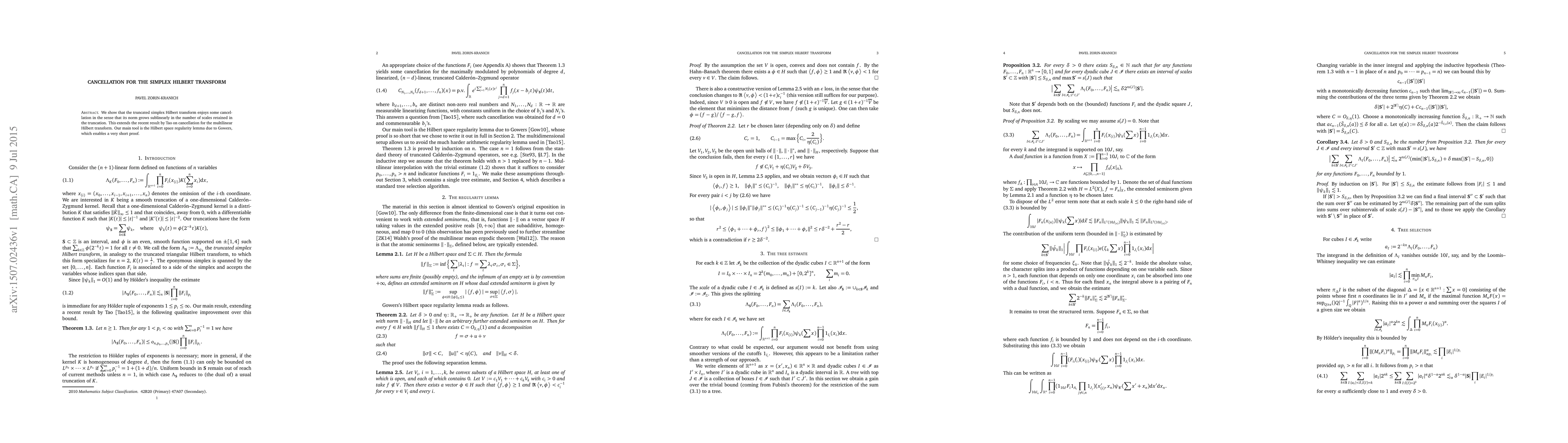 The paper demonstrates that the truncated simplex Hilbert transform exhibits sublinear norm growth with the number of retained scales, extending Tao's results on multilinear Hilbert transform cancellation. The proof leverages Gowers' Hilbert space regularity lemma for conciseness.