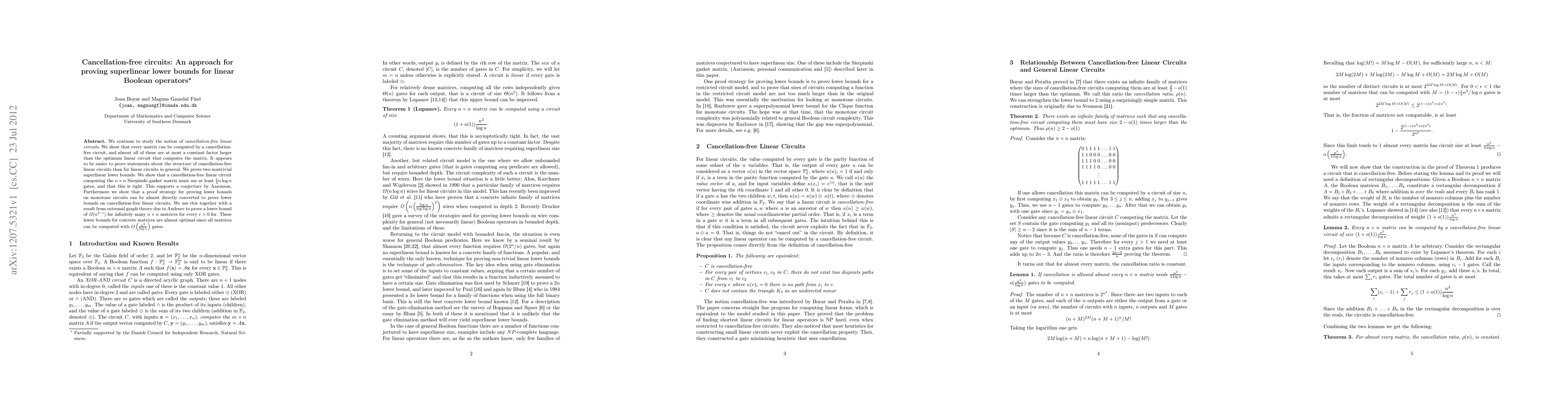 We continue to study the notion of cancellation-free linear circuits. We show that every matrix can be computed by a cancellation- free circuit, and almost all of these are at most a constant factor larger than the optimum linear circuit that computes the matrix. It appears to be easier to prove statements about the structure of cancellation-free linear circuits than for linear circuits in general. We prove two nontrivial superlinear lower bounds. We show that a cancellation-free linear circuit computing the $n\times n$ Sierpinski gasket matrix must use at least 1/2 n logn gates, and that this is tight. This supports a conjecture by Aaronson. Furthermore we show that a proof strategy for proving lower bounds on monotone circuits can be almost directly converted to prove lower bounds on cancellation-free linear circuits. We use this together with a result from extremal graph theory due to Andreev to prove a lower bound of {\Omega}(n^(2- \epsilon)) for infinitely many $n \times n$ matrices for every $\epsilon > 0$ for. These lower bounds for concrete matrices are almost optimal since all matrices can be computed with $O(n^2/\log n)$ gates.