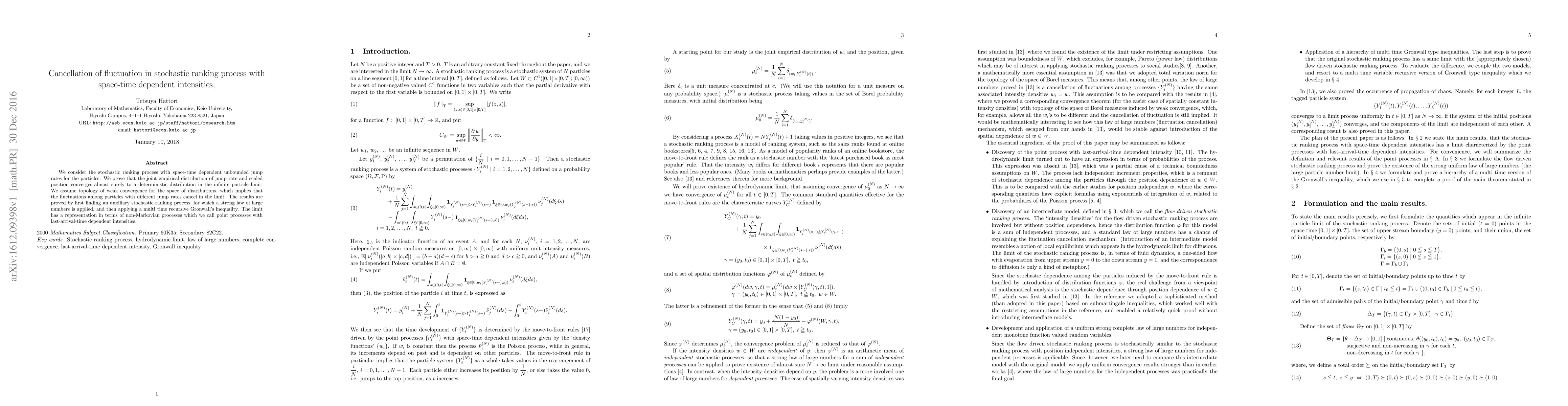 We consider the stochastic ranking process with space-time dependent unbounded jump rates for the particles. We prove that the joint empirical distribution of jump rate and scaled position converges almost surely to a deterministic distribution in the infinite particle limit. We assume topology of weak convergence for the space of distributions, which implies that the fluctuations among particles with different jump rates cancel in the limit. The results are proved by first finding an auxiliary stochastic ranking process, for which a strong law of large numbers is applied, and then applying a multi time recursive Gronwall's inequality. The limit has a representation in terms of non-Markovian processes which we call point processes with last-arrival-time dependent intensities.