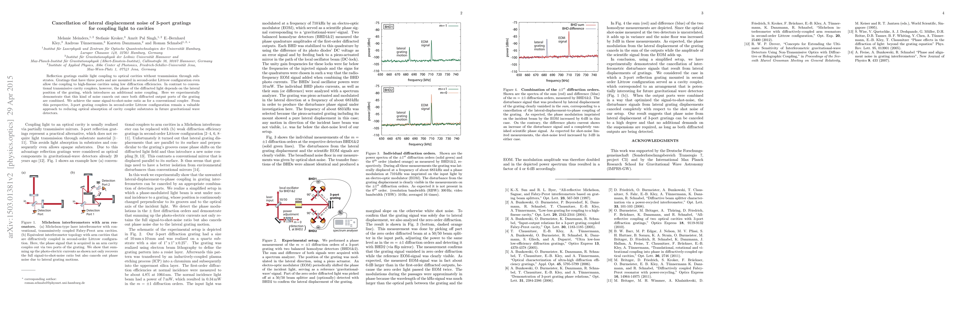 This paper demonstrates that lateral displacement noise in 3-port grating couplers can be canceled by combining the diffracted output ports, achieving the same signal-to-shot-noise ratio as conventional couplers, thus maintaining their potential for reducing optical absorption in future gravitational wave detectors.