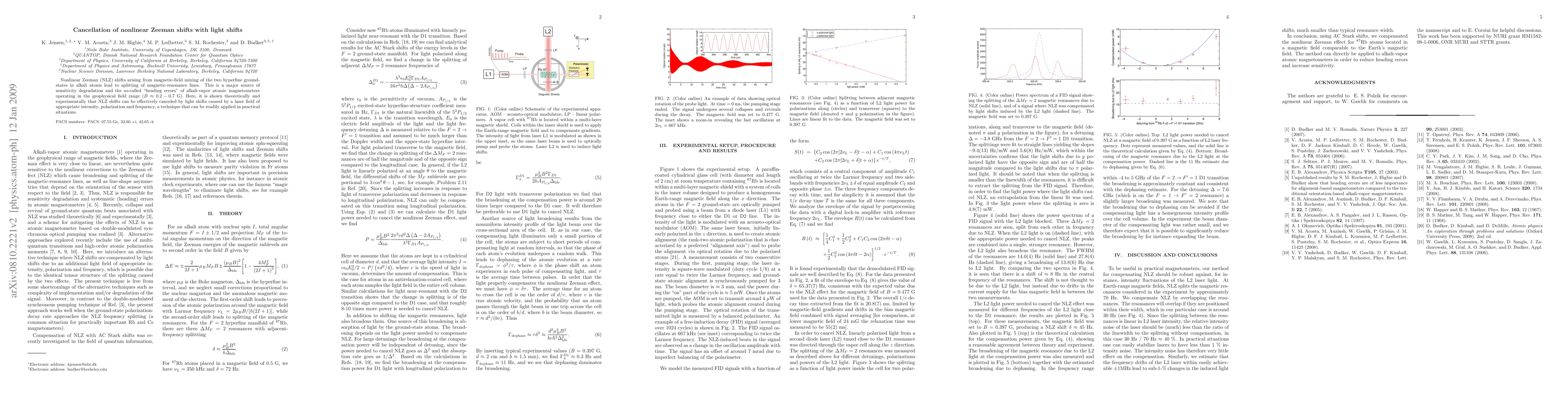 Nonlinear Zeeman (NLZ) shifts arising from magnetic-field mixing of the two hyperfine ground-states in alkali atoms lead to splitting of magnetic-resonance lines. This is a major source of sensitivity degradation and the so-called "heading errors" of alkali-vapor atomic magnetometers operating in the geophysical field range (B approx. 0.2-0.7 G). Here, it is shown theoretically and experimentally that NLZ shifts can be effectively canceled by light shifts caused by a laser field of appropriate intensity, polarization and frequency, a technique that can be readily applied in practical situations.