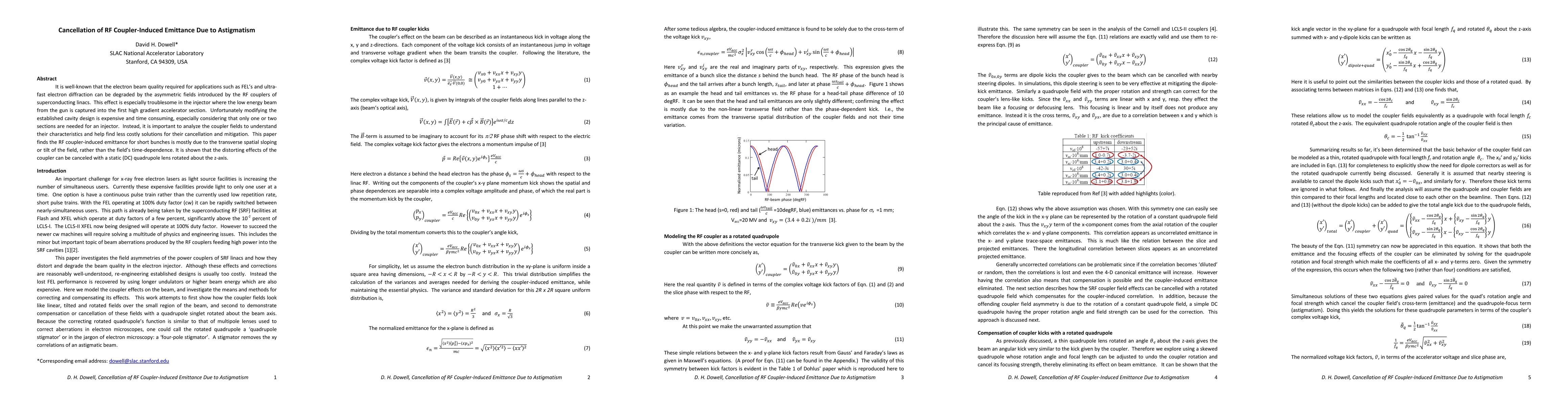 This paper investigates the emittance degradation caused by RF couplers in superconducting linacs, finding that the primary issue arises from the transverse field slope, not its time-dependence. It proposes a cost-effective solution using a static quadrupole lens rotated around the z-axis to cancel these effects.