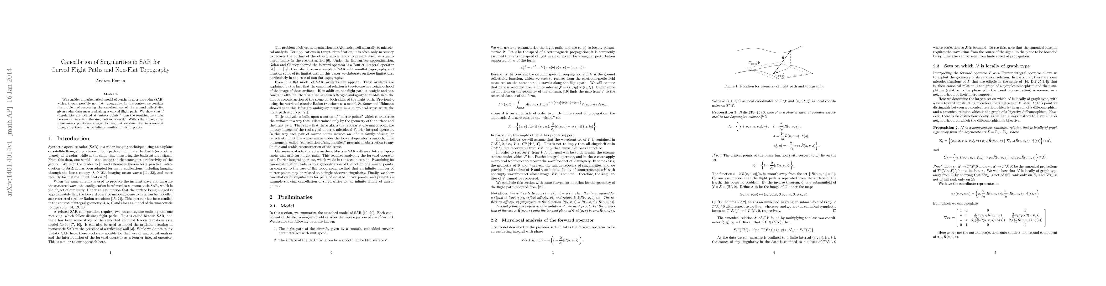 This research explores how singularities in Synthetic Aperture Radar (SAR) data can cancel out when reflectivity has 'mirror points', even along curved flight paths and over non-flat topographies. It reveals that with non-flat topographies, there can be infinite sets of these mirror points.