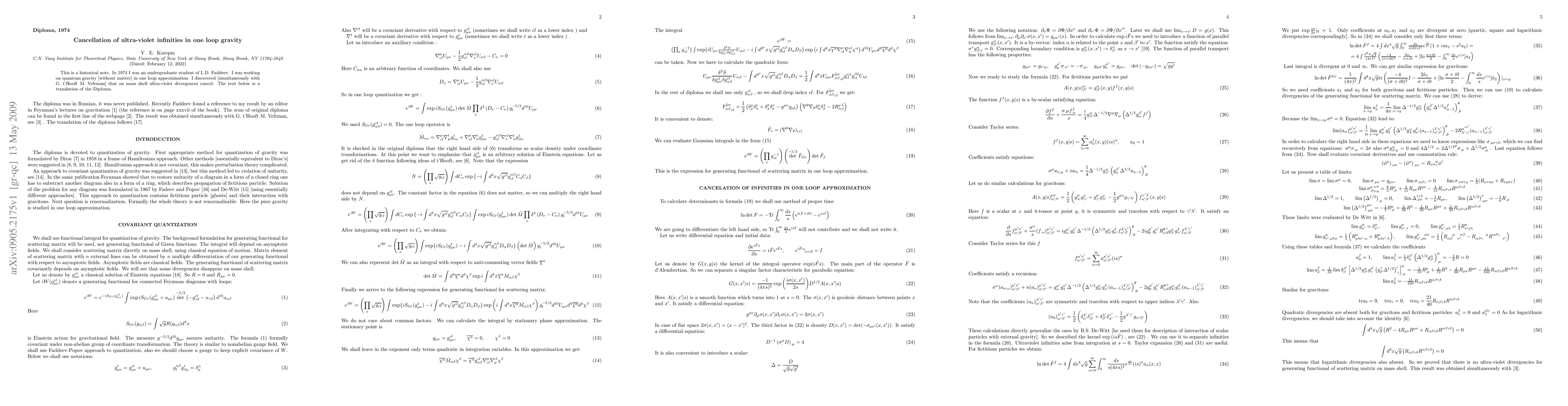 This is a historical note. In 1974 I was an undergraduate student of L.D. Faddeev. I was working on quantum gravity [without matter] in one loop approximation. I discovered [simultaneously with G. t'Hooft M. Veltman] that on mass shell ultra-violet divergences cancel. The submission is a translation of the Diploma.