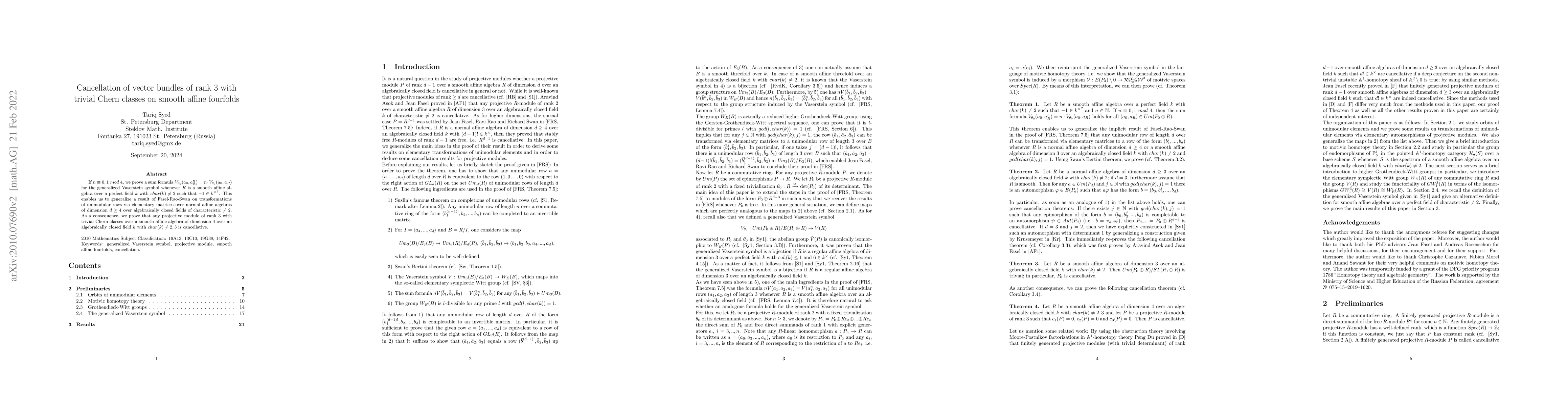 If $n \equiv 0,1~mod~4$, we prove a sum formula $V_{\theta_{0}} (a_{0},a_{R}^{n}) = n \cdot V_{\theta_{0}} (a_{0},a_{R})$ for the generalized Vaserstein symbol whenever $R$ is a smooth affine algebra over a perfect field $k$ with $char(k) \neq 2$ such that $-1 \in {k^{\times}}^{2}$. This enables us to generalize a result of Fasel-Rao-Swan on transformations of unimodular rows via elementary matrices over normal affine algebras of dimension $d \geq 4$ over algebraically closed fields of characteristic $\neq 2$. As a consequence, we prove that any projective module of rank $3$ with trivial Chern classes over a smooth affine algebra of dimension $4$ over an algebraically closed field $k$ with $char(k) \neq 2,3$ is cancellative.