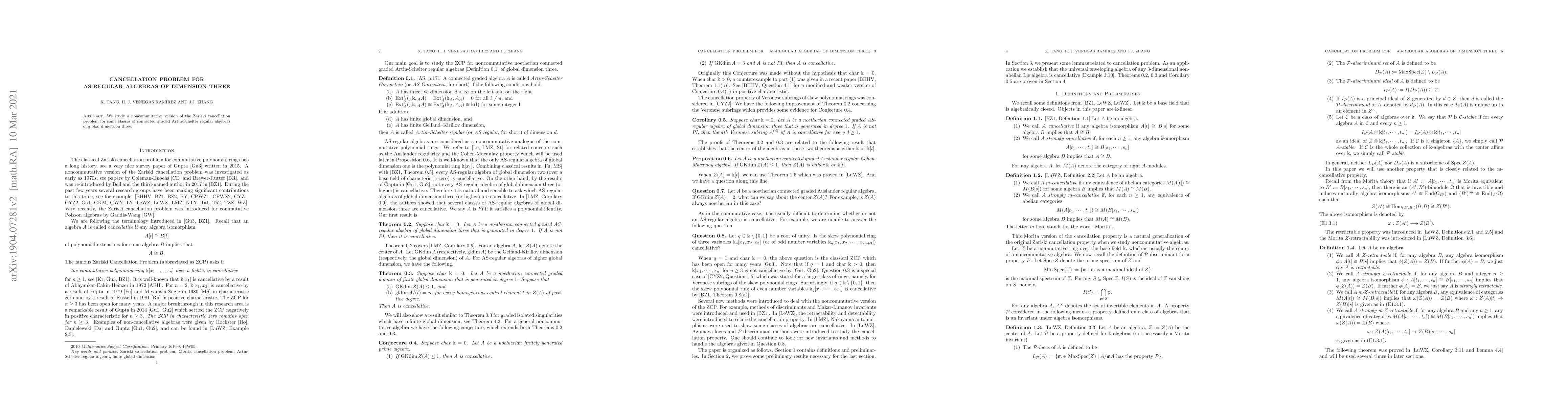 We study a noncommutative version of the Zariski cancellation problem for some classes of connected graded Artin-Schelter regular algebras of global dimension three.