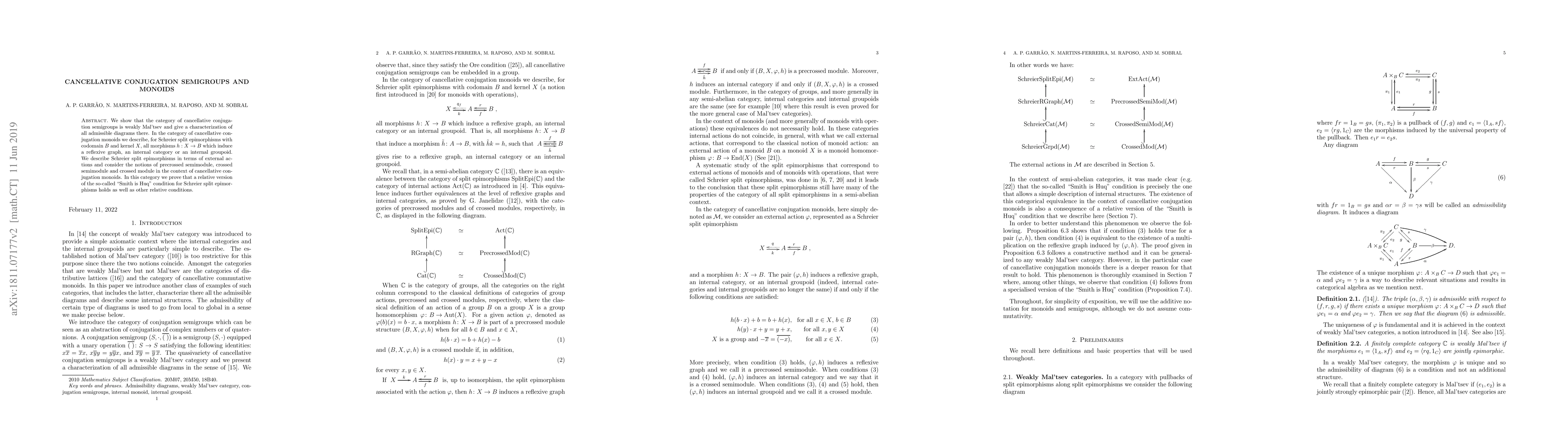 We show that the category of cancellative conjugation semigroups is weakly Mal'tsev and give a characterization of all admissible diagrams there. In the category of cancellative conjugation monoids we describe, for Schreier split epimorphisms with codomain B and kernel X, all morphisms h from X to B which induce a reflexive graph, an internal category or an internal groupoid. We describe Schreier split epimorphisms in terms of external actions and consider the notions of precrossed semimodule, crossed semimodule and crossed module in the context of cancellative conjugation monoids. In this category we prove that a relative version of the so-called "Smith is Huq" condition for Schreier split epimorphisms holds as well as other relative conditions.