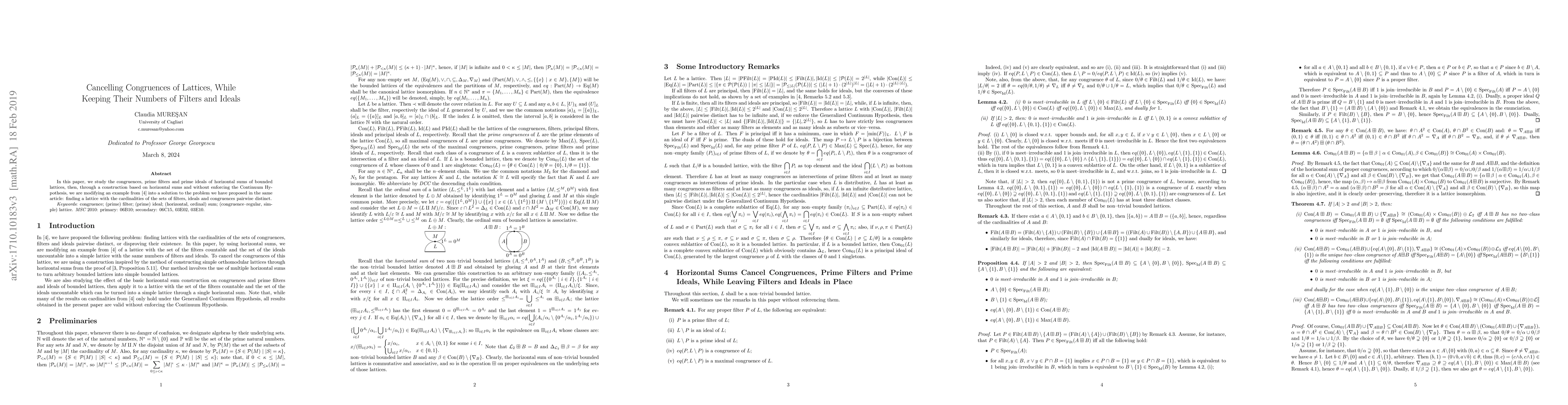 In this paper, we study the congruences, prime filters and prime ideals of horizontal sums of bounded lattices, then, through a construction based on horizontal sums and without enforcing the Continuum Hypothesis, we are modifying an example from \cite{eucard} into a solution to the problem we have proposed in the same article: finding a lattice with the cardinalities of the sets of filters, ideals and congruences pairwise distinct.