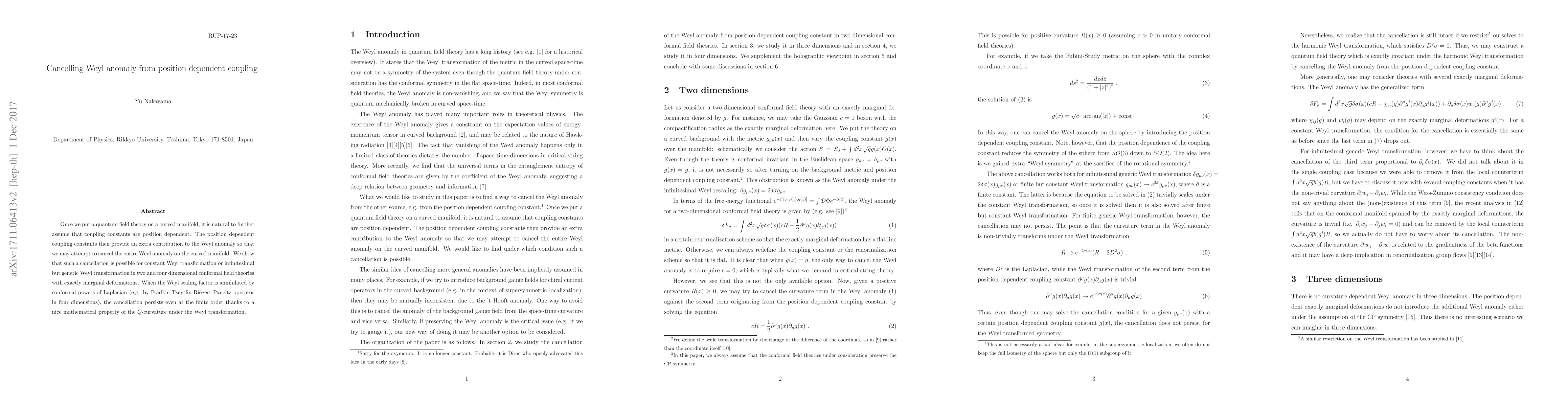 Once we put a quantum field theory on a curved manifold, it is natural to further assume that coupling constants are position dependent. The position dependent coupling constants then provide an extra contribution to the Weyl anomaly so that we may attempt to cancel the entire Weyl anomaly on the curved manifold. We show that such a cancellation is possible for constant Weyl transformation or infinitesimal but generic Weyl transformation in two and four dimensional conformal field theories with exactly marginal deformations. When the Weyl scaling factor is annihilated by conformal powers of Laplacian (e.g. by Fradkin-Tseytlin-Riegert-Paneitz operator in four dimensions), the cancellation persists even at the finite order thanks to a nice mathematical property of the $Q$-curvature under the Weyl transformation.