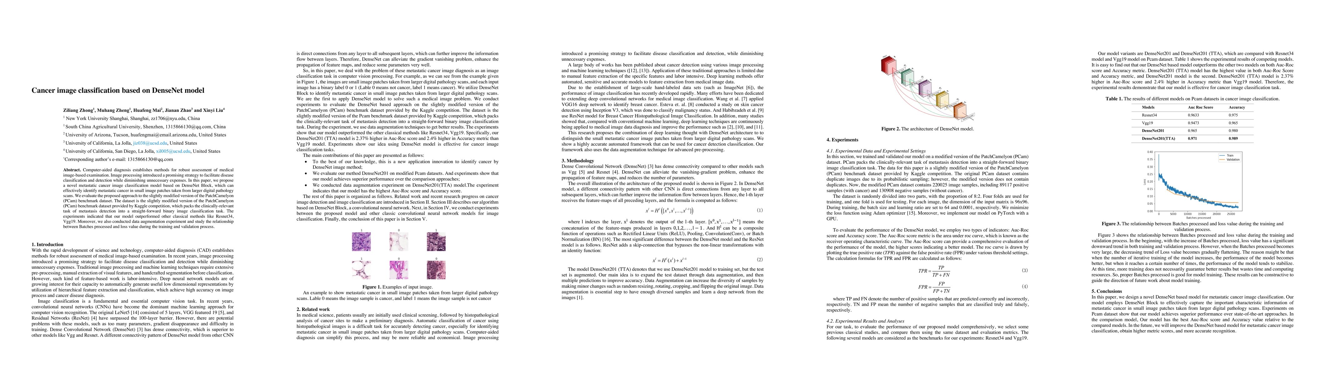 Computer-aided diagnosis establishes methods for robust assessment of medical image-based examination. Image processing introduced a promising strategy to facilitate disease classification and detection while diminishing unnecessary expenses. In this paper, we propose a novel metastatic cancer image classification model based on DenseNet Block, which can effectively identify metastatic cancer in small image patches taken from larger digital pathology scans. We evaluate the proposed approach to the slightly modified version of the PatchCamelyon (PCam) benchmark dataset. The dataset is the slightly modified version of the PatchCamelyon (PCam) benchmark dataset provided by Kaggle competition, which packs the clinically-relevant task of metastasis detection into a straight-forward binary image classification task. The experiments indicated that our model outperformed other classical methods like Resnet34, Vgg19. Moreover, we also conducted data augmentation experiment and study the relationship between Batches processed and loss value during the training and validation process.