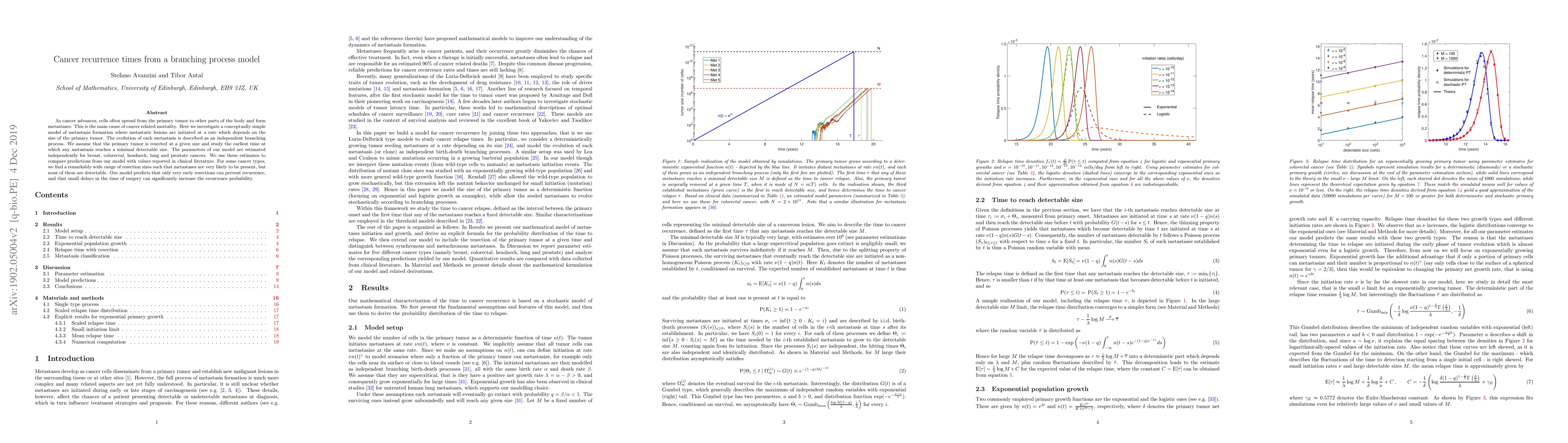 As cancer advances, cells often spread from the primary tumor to other parts of the body and form metastases. This is the main cause of cancer related mortality. Here we investigate a conceptually simple model of metastasis formation where metastatic lesions are initiated at a rate which depends on the size of the primary tumor. The evolution of each metastasis is described as an independent branching process. We assume that the primary tumor is resected at a given size and study the earliest time at which any metastasis reaches a minimal detectable size. The parameters of our model are estimated independently for breast, colorectal, headneck, lung and prostate cancers. We use these estimates to compare predictions from our model with values reported in clinical literature. For some cancer types, we find a remarkably wide range of resection sizes such that metastases are very likely to be present, but none of them are detectable. Our model predicts that only very early resections can prevent recurrence, and that small delays in the time of surgery can significantly increase the recurrence probability.