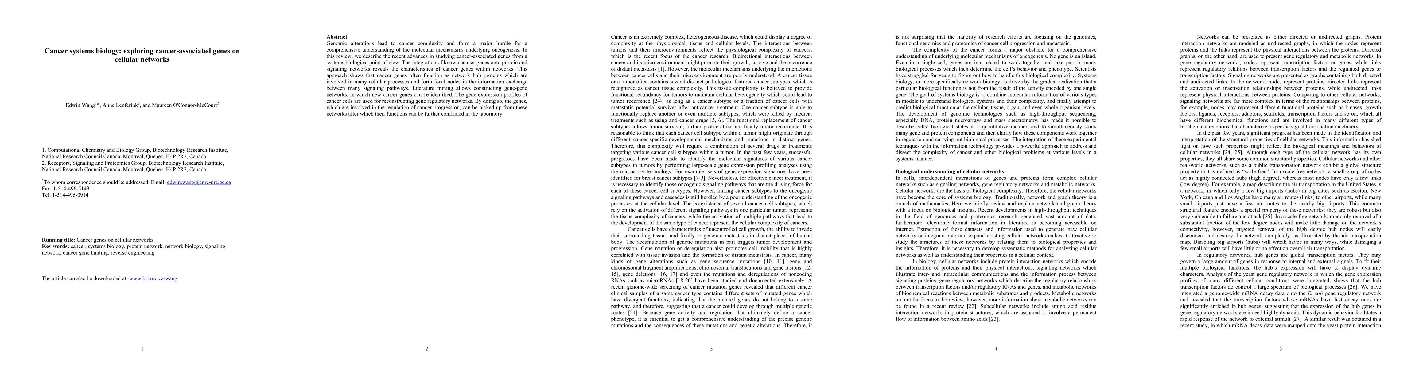 This review explores recent advances in cancer systems biology, focusing on integrating cancer-associated genes into cellular networks to understand their roles as hub proteins in multiple cellular processes. It highlights the use of gene expression profiles to reconstruct gene regulatory networks for identifying genes involved in cancer progression.