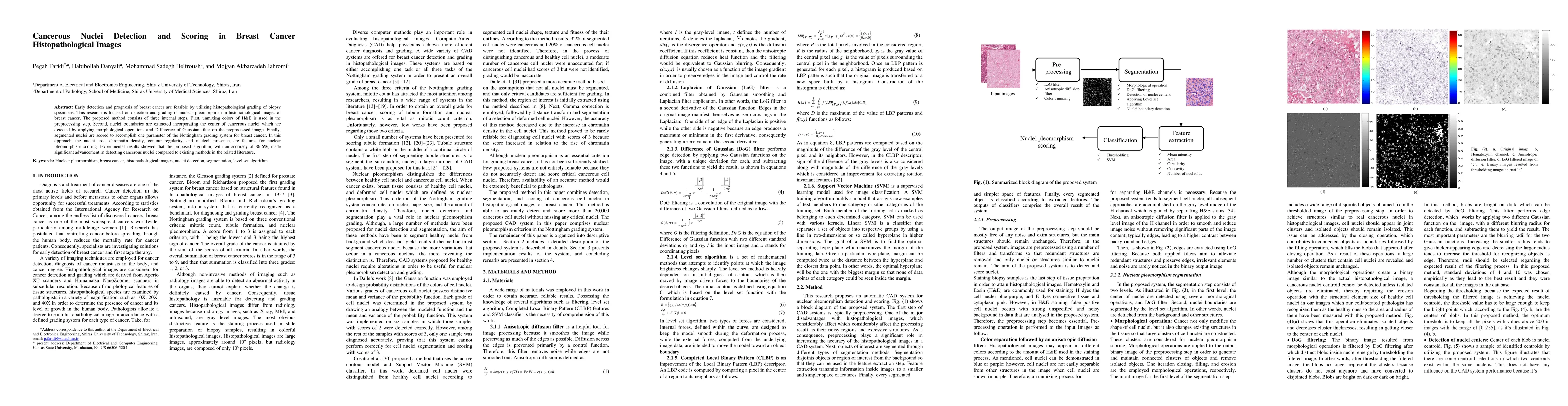 This research proposes a method for detecting and grading nuclear pleomorphism in breast cancer histopathological images, achieving an 86.6% accuracy. The algorithm involves preprocessing with H&E color unmixing, nuclei boundary extraction, and scoring based on nuclei area, chromatin density, contour regularity, and nucleoli presence.