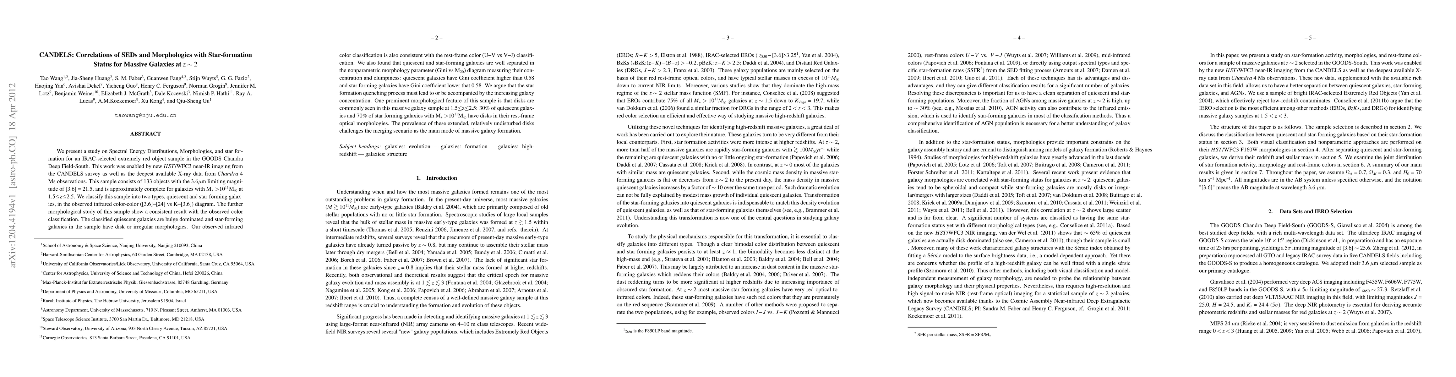 This study uses CANDELS survey data to analyze the correlation between Spectral Energy Distributions, morphologies, and star-formation in massive galaxies at z ~ 2. It finds that quiescent galaxies are bulge-dominated while star-forming galaxies exhibit disk or irregular morphologies, suggesting that star formation quenching is linked to increased galaxy concentration.