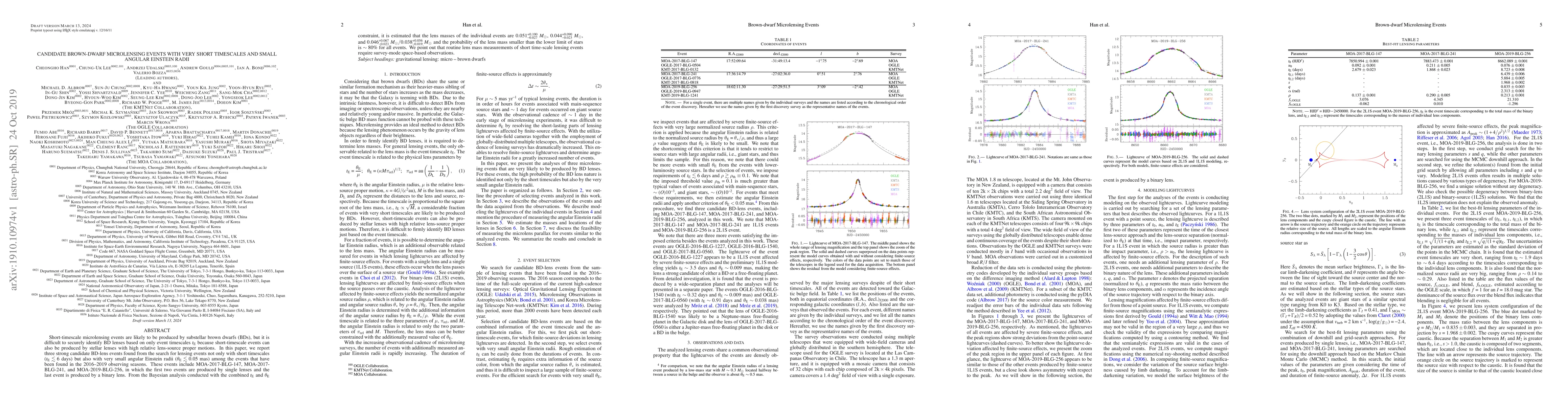 Short-timescale microlensing events are likely to be produced by substellar brown dwarfs (BDs), but it is difficult to securely identify BD lenses based on only event timescales $t_{\rm E}$ because short-timescale events can also be produced by stellar lenses with high relative lens-source proper motions. In this paper, we report three strong candidate BD-lens events found from the search for lensing events not only with short timescales ($t_{\rm E} \lesssim 6~{\rm days}$) but also with very small angular Einstein radii ($\theta_{\rm E}\lesssim 0.05~{\rm mas}$) among the events that have been found in the 2016--2019 observing seasons. These events include MOA-2017-BLG-147, MOA-2017-BLG-241, and MOA-2019-BLG-256, in which the first two events are produced by single lenses and the last event is produced by a binary lens. From the Bayesian analysis conducted with the combined $t_{\rm E}$ and $\theta_{\rm E}$ constraint, it is estimated that the lens masses of the individual events are $0.051^{+0.100}_{-0.027}~M_\odot$, $0.044^{+0.090}_{-0.023}~M_\odot$, and $0.046^{+0.067}_{-0.023}~M_\odot/0.038^{+0.056}_{-0.019}~M_\odot$ and the probability of the lens mass smaller than the lower limit of stars is $\sim 80\%$ for all events. We point out that routine lens mass measurements of short time-scale lensing events require survey-mode space-based observations.