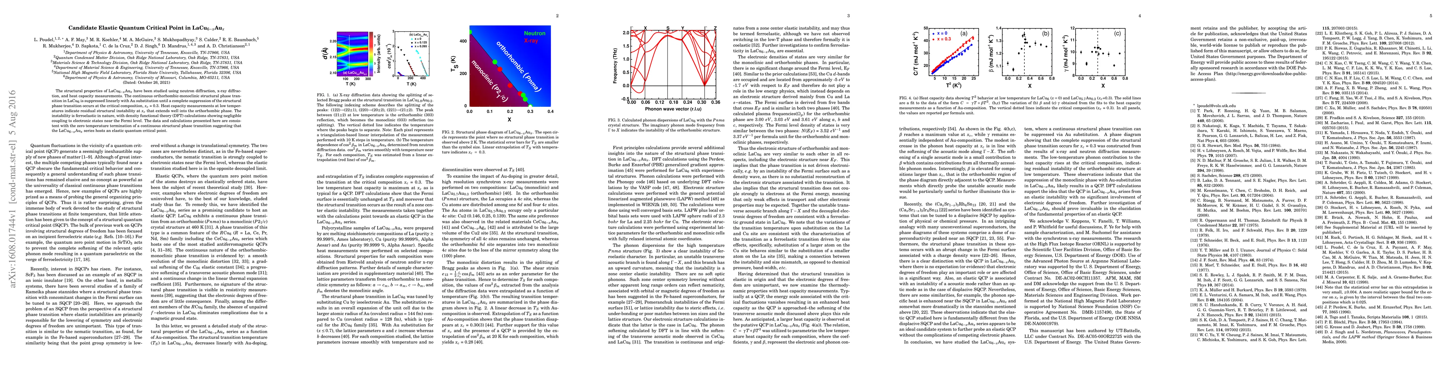 The structural properties of LaCu$_{6-x}$Au$_x$ have been studied using neutron diffraction, x-ray diffraction, and heat capacity measurements. The continuous orthorhombic-monoclinic structural phase transition in LaCu$_{6}$ is suppressed linearly with Au substitution until a complete suppression of the structural phase transition occurs at the critical composition, $x_{c}$ = 0.3. Heat capacity measurements at low temperatures indicate residual structural instability at $x_c$ that extends well into the orthorhombic phase. The instability is ferroelastic in nature, with density functional theory (DFT) calculations showing negligible coupling to electronic states near the Fermi level. The data and calculations presented here are consistent with the zero temperature termination of a continuous structural phase transition suggesting that the LaCu$_{6-x}$Au$_x$ series hosts an elastic quantum critical point.
