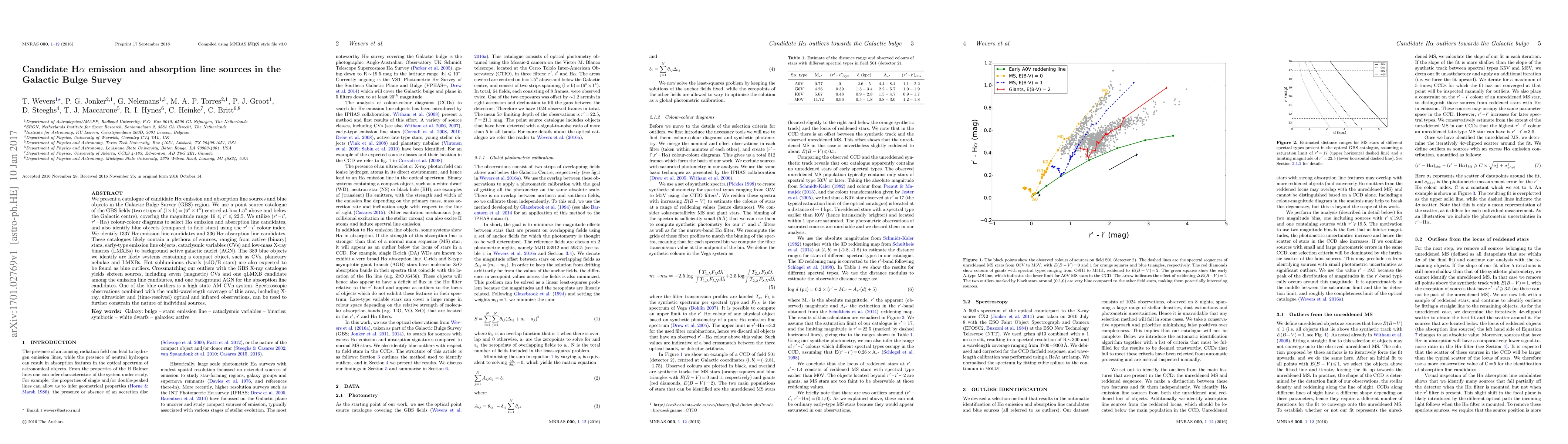We present a catalogue of candidate H{\alpha} emission and absorption line sources and blue objects in the Galactic Bulge Survey (GBS) region. We use a point source catalogue of the GBS fields (two strips of (l x b) = (6 x 1) degrees centred at b = 1.5 above and below the Galactic centre), covering the magnitude range 16 < r' < 22.5. We utilize (r'-i', r'-H{\alpha}) colour-colour diagrams to select H{\alpha} emission and absorption line candidates, and also identify blue objects (compared to field stars) using the r'-i' colour index. We identify 1337 H{\alpha} emission line candidates and 336 H{\alpha} absorption line candidates. These catalogues likely contain a plethora of sources, ranging from active (binary) stars, early-type emission line objects, cataclysmic variables (CVs) and low-mass X-ray binaries (LMXBs) to background active galactic nuclei (AGN). The 389 blue objects we identify are likely systems containing a compact object, such as CVs, planetary nebulae and LMXBs. Hot subluminous dwarfs (sdO/B stars) are also expected to be found as blue outliers. Crossmatching our outliers with the GBS X-ray catalogue yields sixteen sources, including seven (magnetic) CVs and one qLMXB candidate among the emission line candidates, and one background AGN for the absorption line candidates. One of the blue outliers is a high state AM CVn system. Spectroscopic observations combined with the multi-wavelength coverage of this area, including X-ray, ultraviolet and (time-resolved) optical and infrared observations, can be used to further constrain the nature of individual sources.